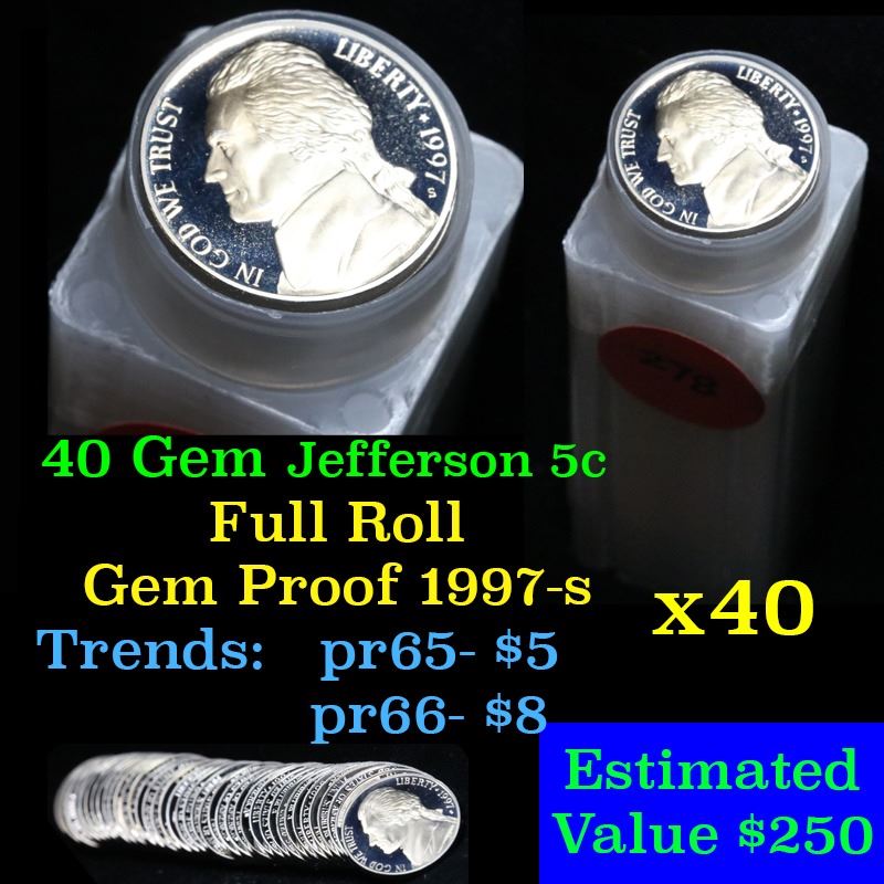 Proof 1997-s Jefferson nickel 5c roll, 40 pieces. A great proof roll of Jefferson nickels. All coins are deep cameo. In pr65dcam, it trends $6/coin, $240.