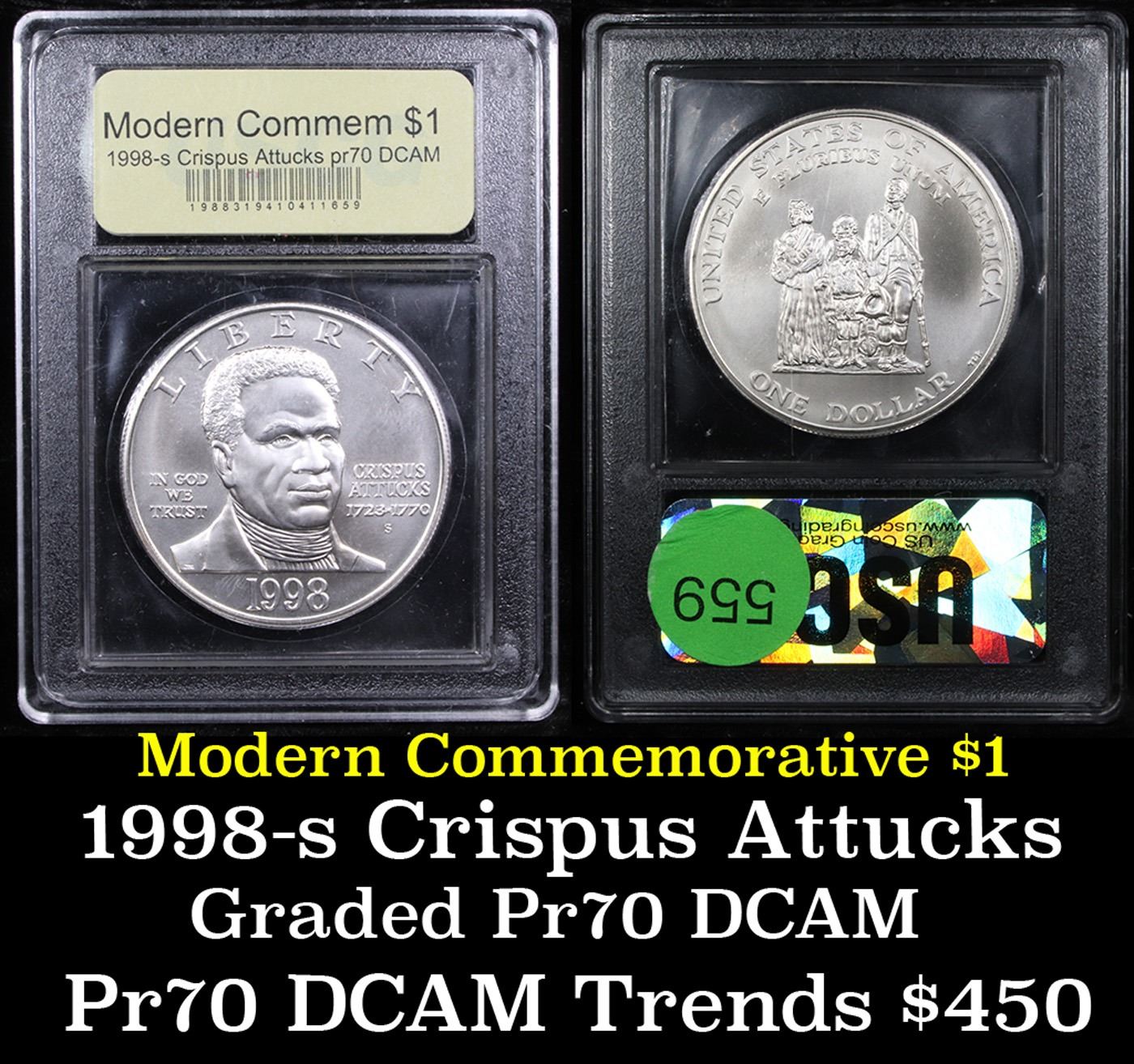 1998-S Black Patriots Modern Commem Dollar $1 Graded GEM++ Proof Deep Cameo By USCG. The 1998 Black Revolutionary War Patriots Silver Dollar was issued to mark the 275th anniversary of the birth of Crispus Attucks. He was the first patriot killed during the Boston Massacre in 1770, one of the events leading up to the Revolutionary War. Encapsulated and Garded pr70 dcam by USCG.