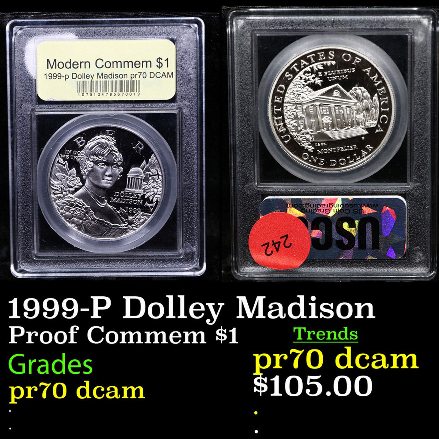 Proof . 1999-P Dolley Madison Modern Commem Dollar $1 Graded GEM++ Proof Deep Cameo By USCG
