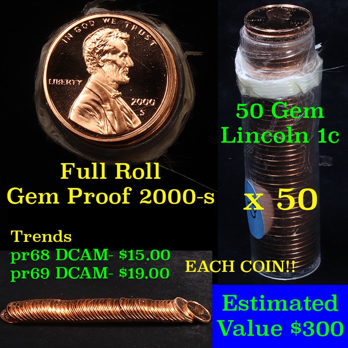 Proof 2000-s Lincoln cent 1c roll, 50 pieces (fc). A terrific proof roll of Lincoln cents. All red, and deep cameo. Trends pr68rd dcam is $15/coin, Pr69 DCAM $19/coin Estimate $300