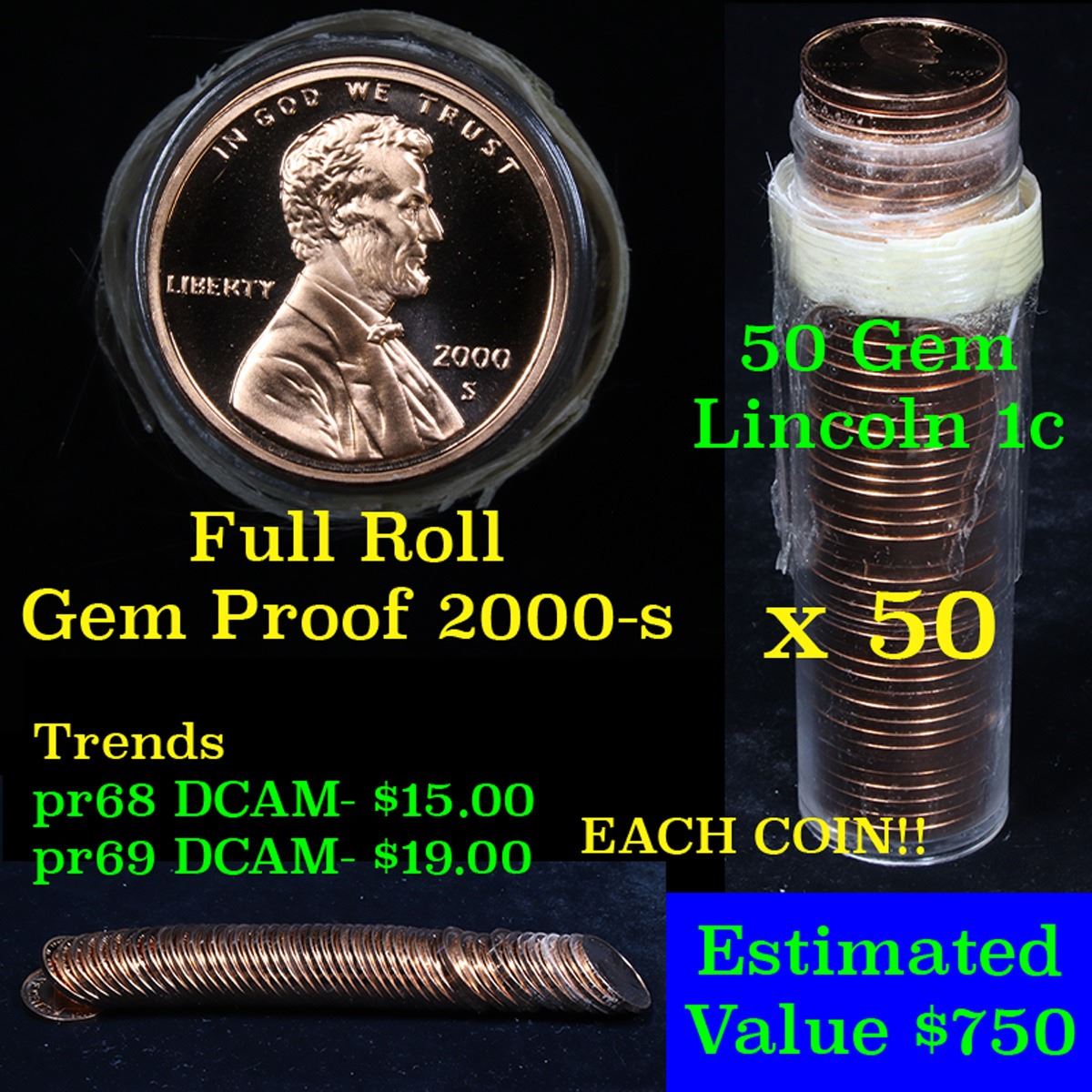 Proof 2000-s Lincoln cent 1c roll, 50 pieces (fc).        A terrific proof roll of Lincoln cents.  All red, and deep cameo.  Trends pr68rd dcam is $15/coin, Pr69 DCAM $19/coin Estimate $750