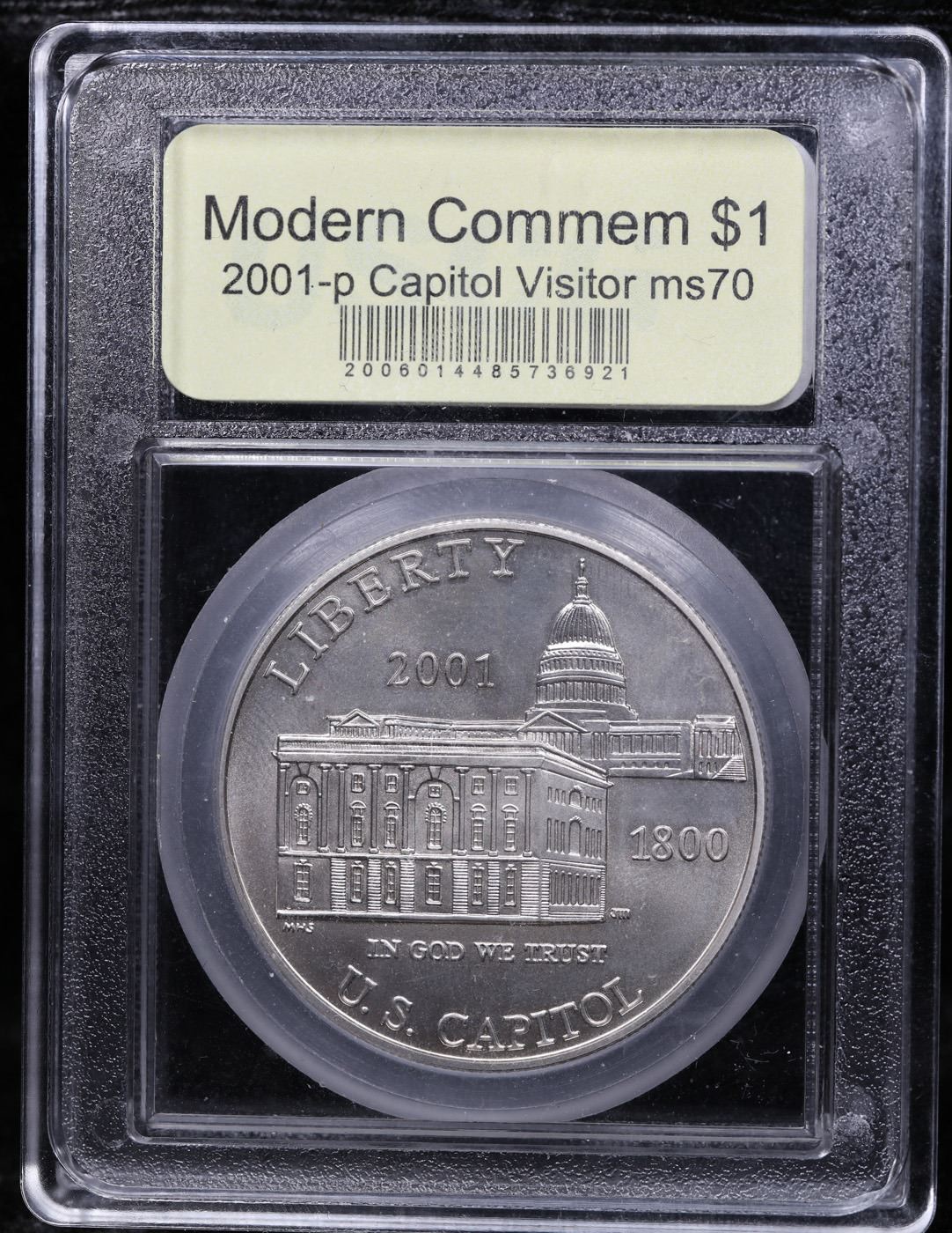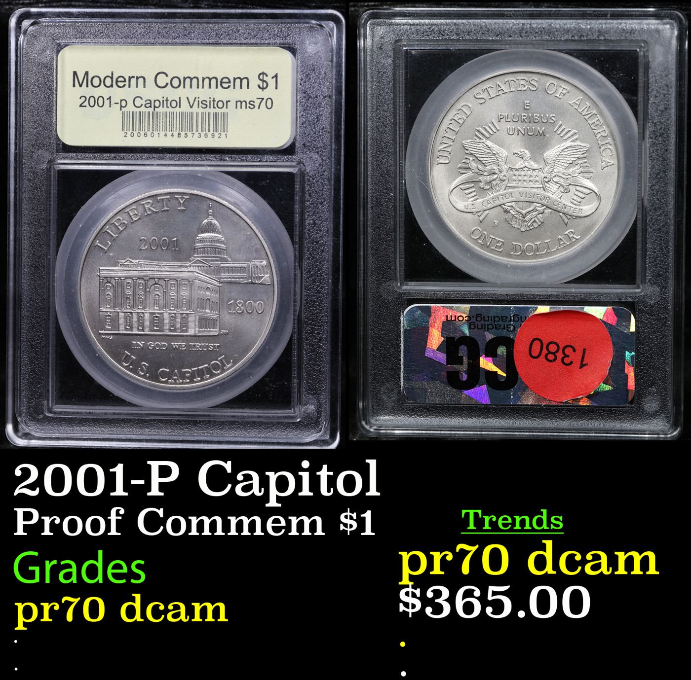 2001-P Capitol Modern Commem Dollar $1 Graded GEM++ Proof Deep Cameo By USCG. The 2001 Capitol Visitor Center Silver Dollar was issued as part of the commemorative coin program authorized for the proposed Capitol Visitor Center in Washington, DC. The program included three different coins issued in proof and uncirculated versions. This Proof Commemorative Dollar is Graded PR70 Deep Cameo by USCG.