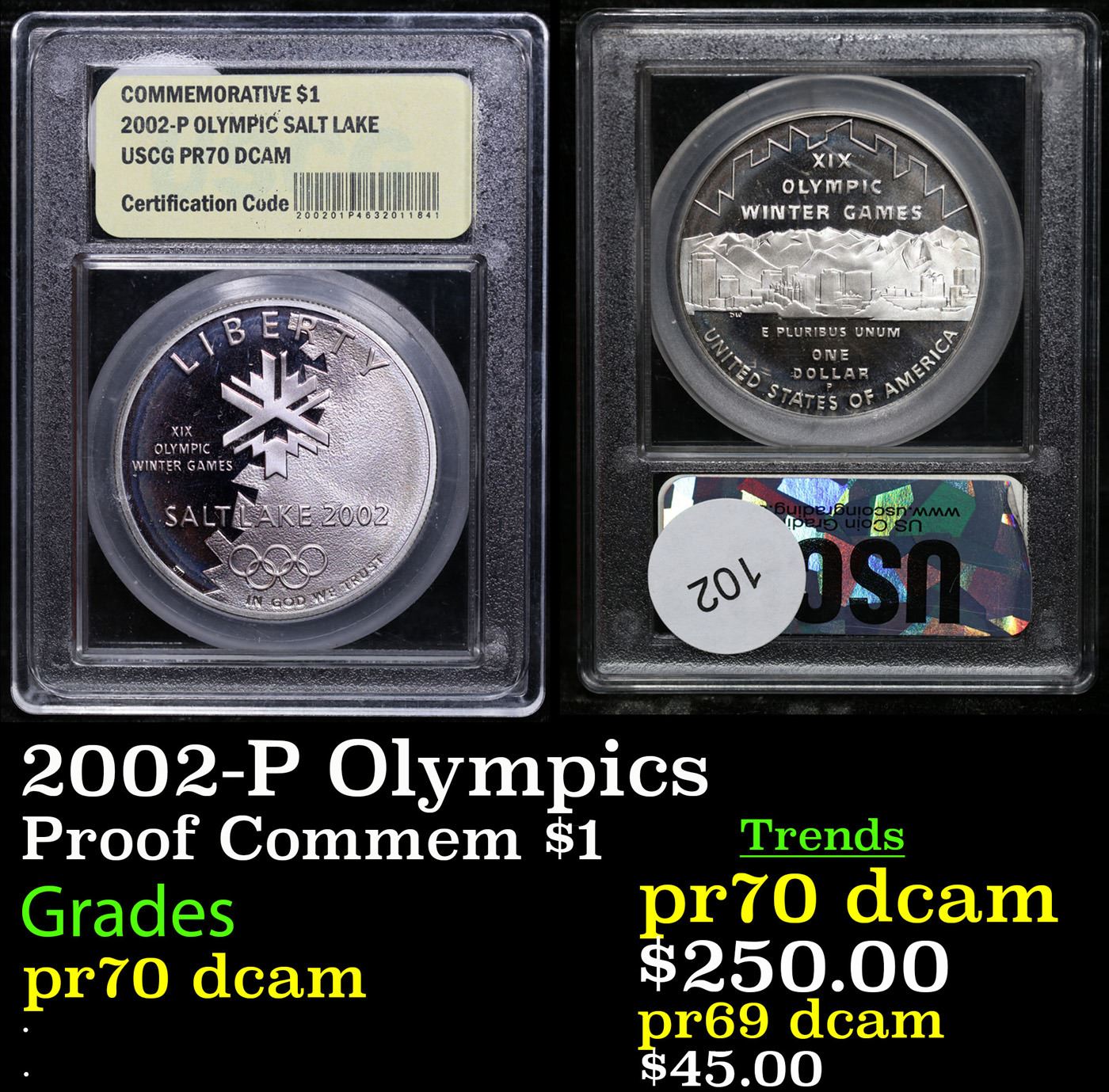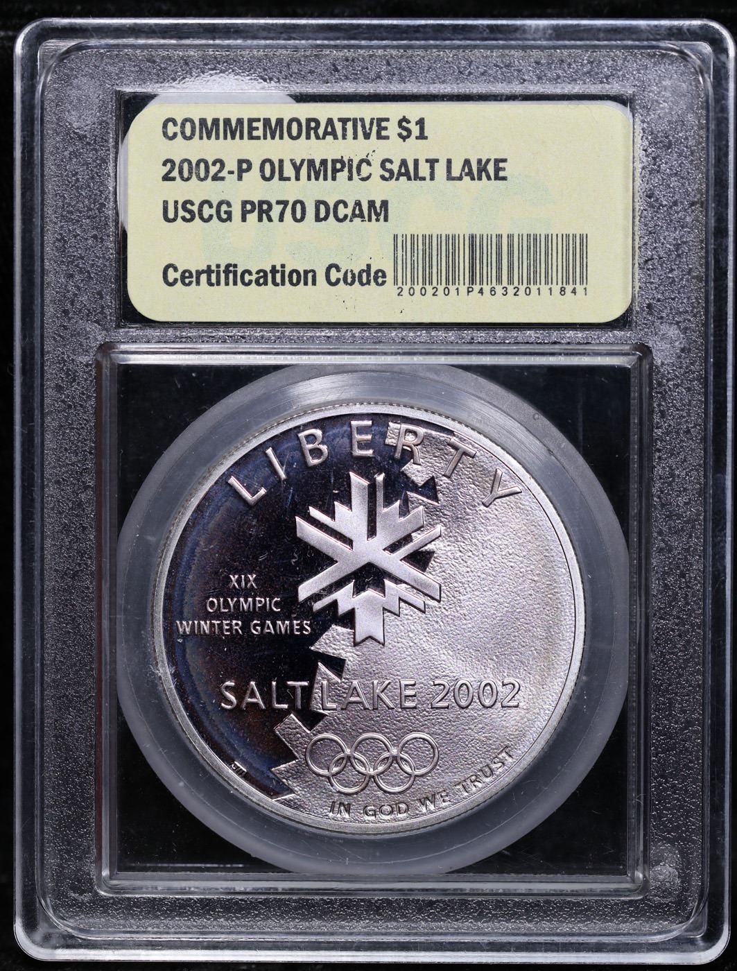 2002-P Olympics Modern Commem Dollar $1 Graded GEM++ Proof Deep Cameo By USCG. The 2002 Olympic Salt Lake City Silver Dollar was issued for the 2002 Winter Olympics held in Salt Lake City, Utah. This example is graded Perfection Gem+++ Proof DCAM by USCG.