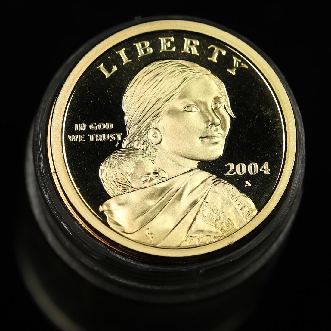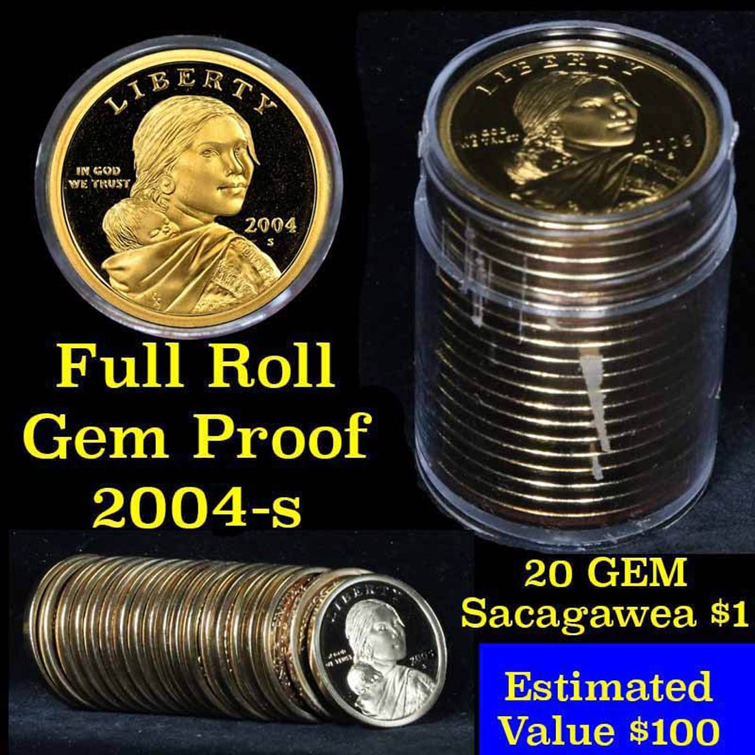 Proof 2004-s Sacagawea dollar roll $1, 20 pieces. Beautiful proof roll. All 20 coins are deep cameo. All pristine Gem+ coins. Pr65 DCAM trends $12.50/coin, $250