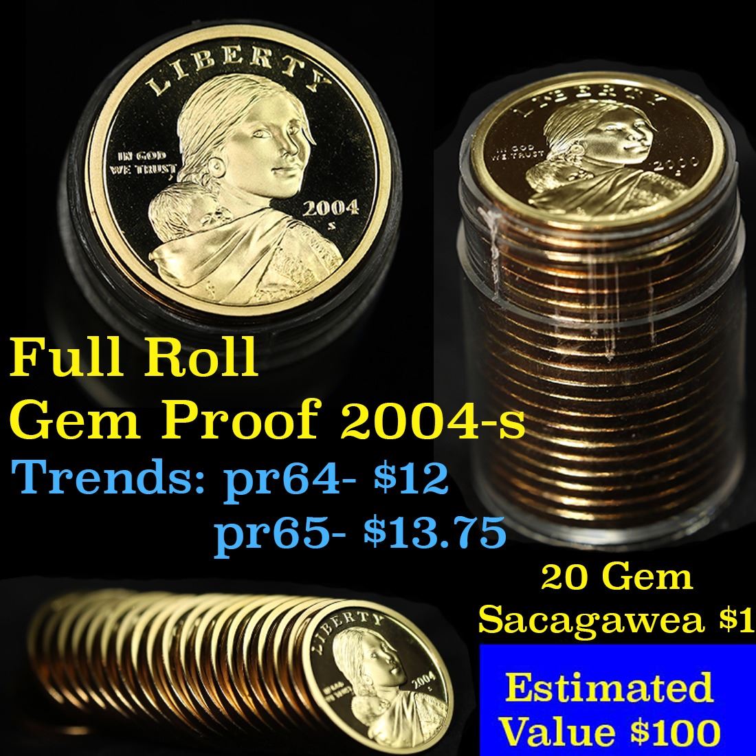 Proof 2004-s Sacagawea dollar roll $1, 20 pieces. Beautiful proof roll. All 20 coins are deep cameo. All pristine Gem+ coins. Pr65 DCAM trends $12.50/coin, $250
