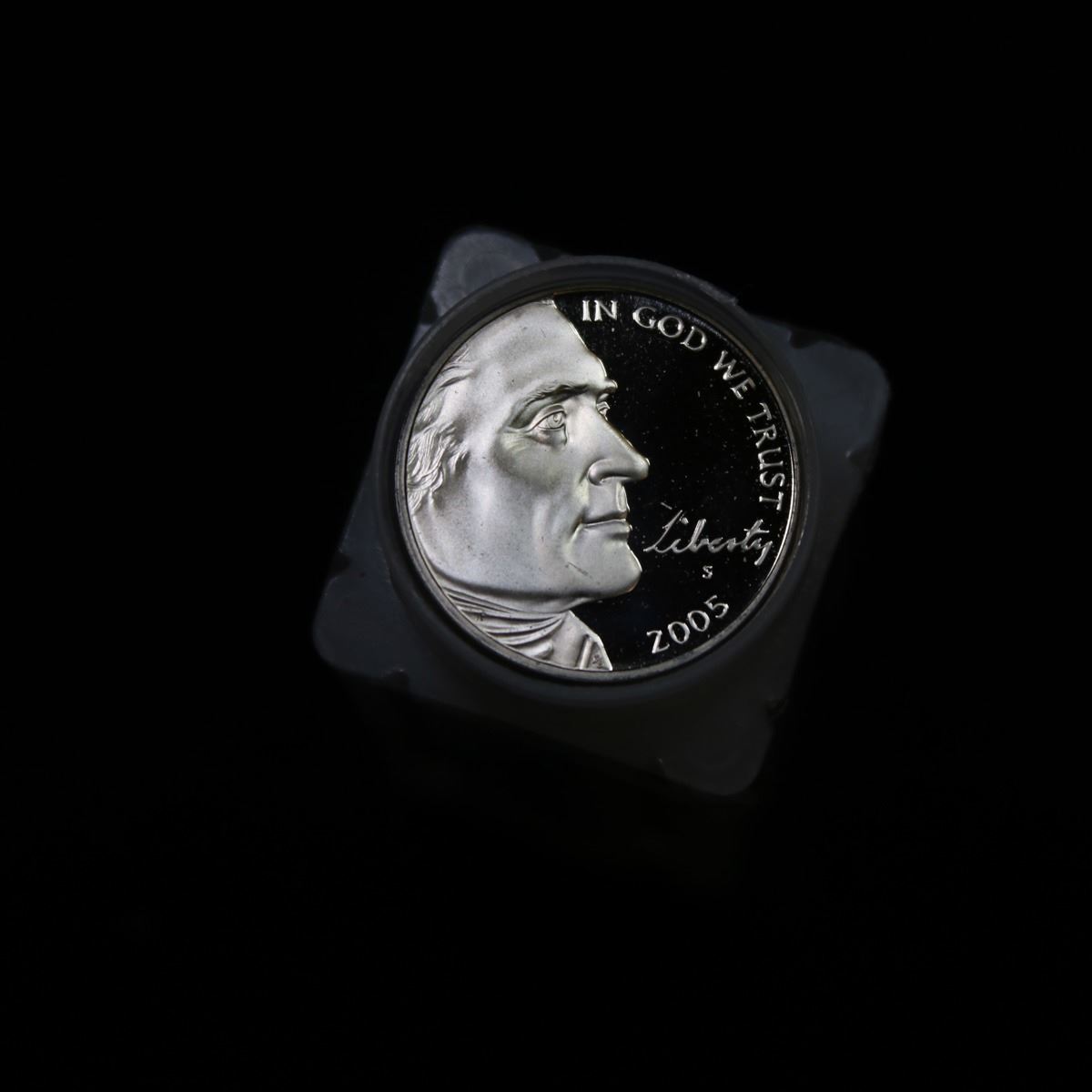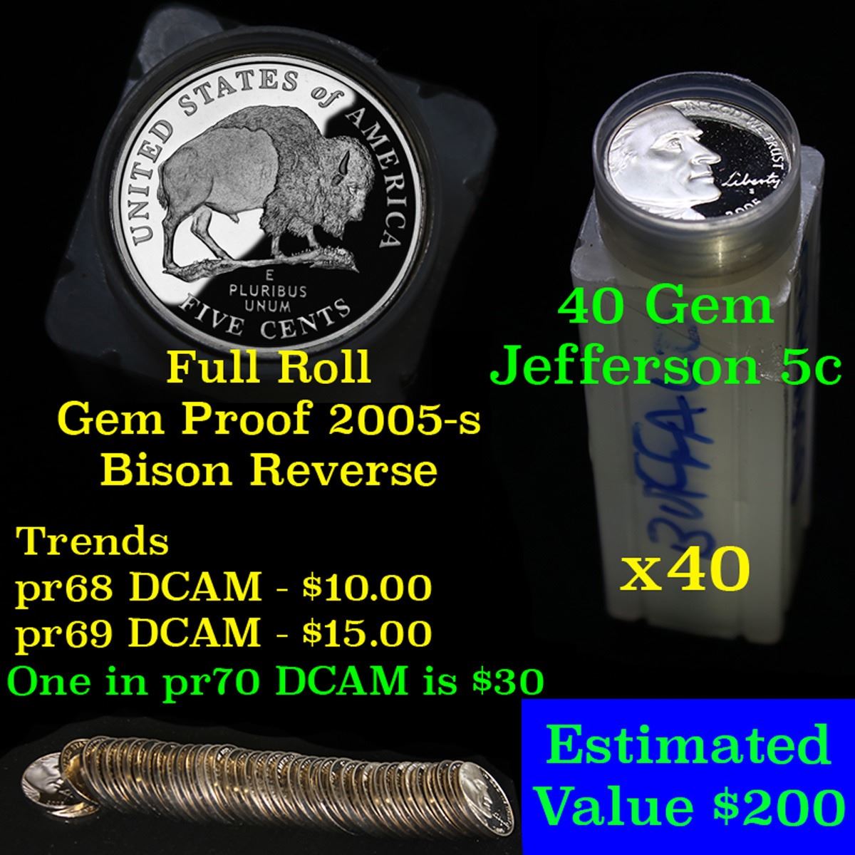 Proof 2005-s Buffalo Jefferson nickel 5c roll, 40 pieces . .. A great proof roll of Jefferson nickels. All coins are deep cameo. In pr68 DCAM $10/coin PR69 DCAM $15/coin
