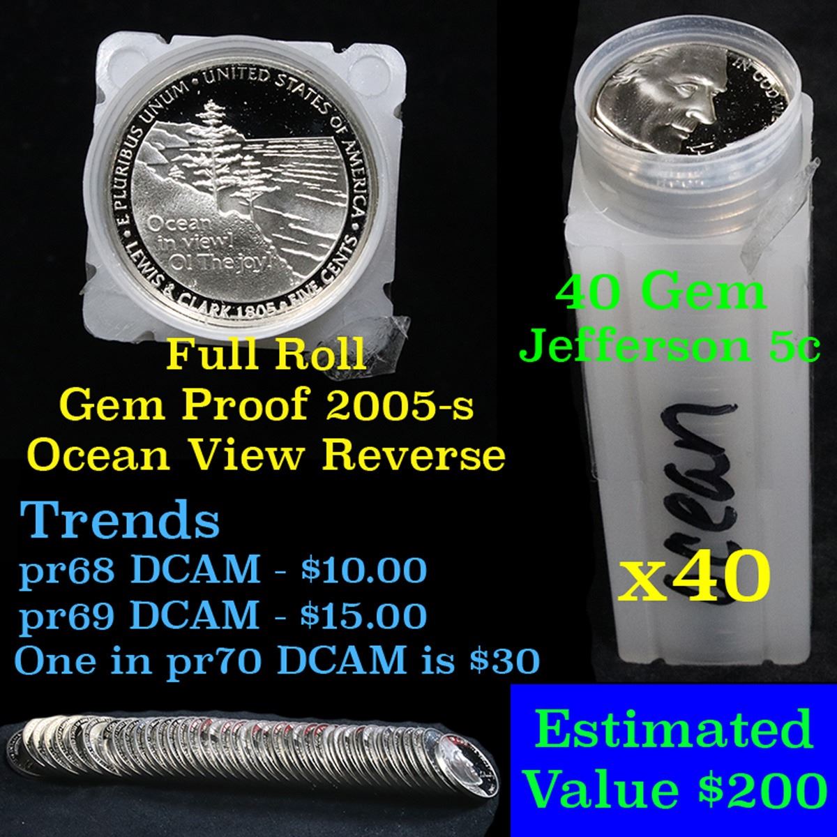 Proof 2005-s Ocean View Jefferson nickel 5c roll, 40 pieces . .. A great proof roll of Jefferson nickels. All coins are deep cameo. In pr68 DCAM $10/coin PR69 DCAM $15/coin