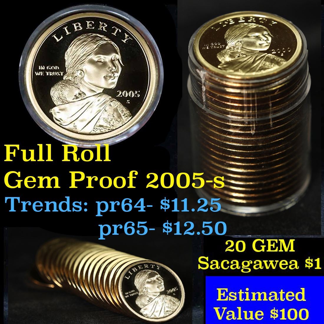 Proof 2005-s Sacagawea dollar roll $1, 20 pieces. Beautiful proof roll. All 20 coins are deep cameo. All pristine Gem+ coins. Pr65 DCAM trends $12.50/coin, $250