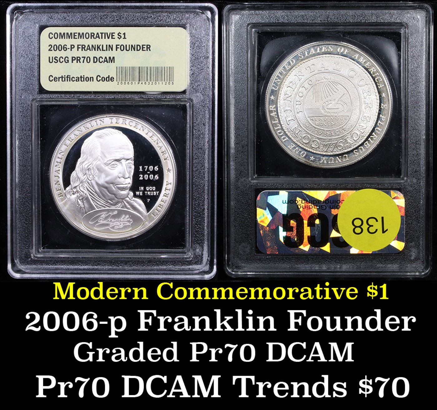 2006-P Ben Franklin Founding Father Modern Commem Dollar $1 Graded GEM++ Proof Deep Cameo By USCG. This coin was issued in two varieties. One scientist and one founding father. Both are issued to commemorate the 300th anniversary of Franklin's birth. This Proof Commemorative is Encapsulated and Graded PR70 DCAM by USCG.