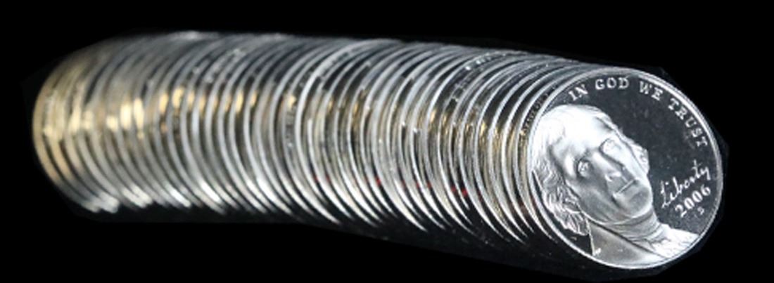Proof 2006-s Jefferson nickel 5c roll, 40 pieces (fc). A great proof roll of Jefferson nickels. All coins are deep cameo. In pr65dcam, it trends $5/coin, $200.