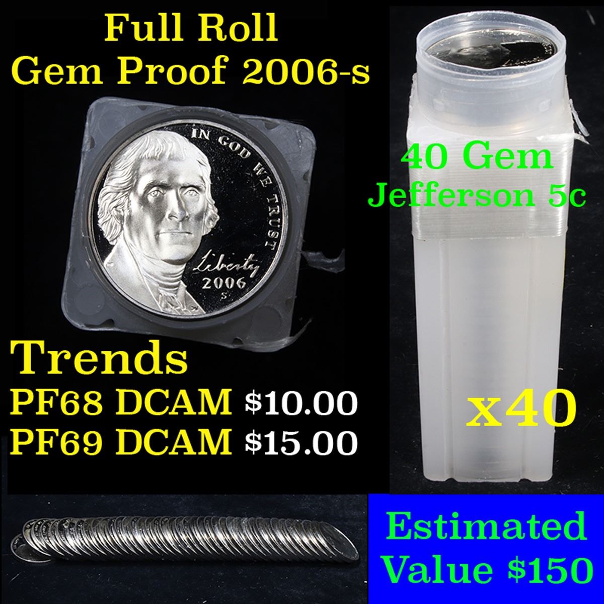 Proof 2006-s Jefferson nickel 5c roll, 40 pieces. A great proof roll of Jefferson nickels. All coins are deep cameo. In pr68 DCAM $10/coin PR69 DCAM $15/coin. Estimate $400