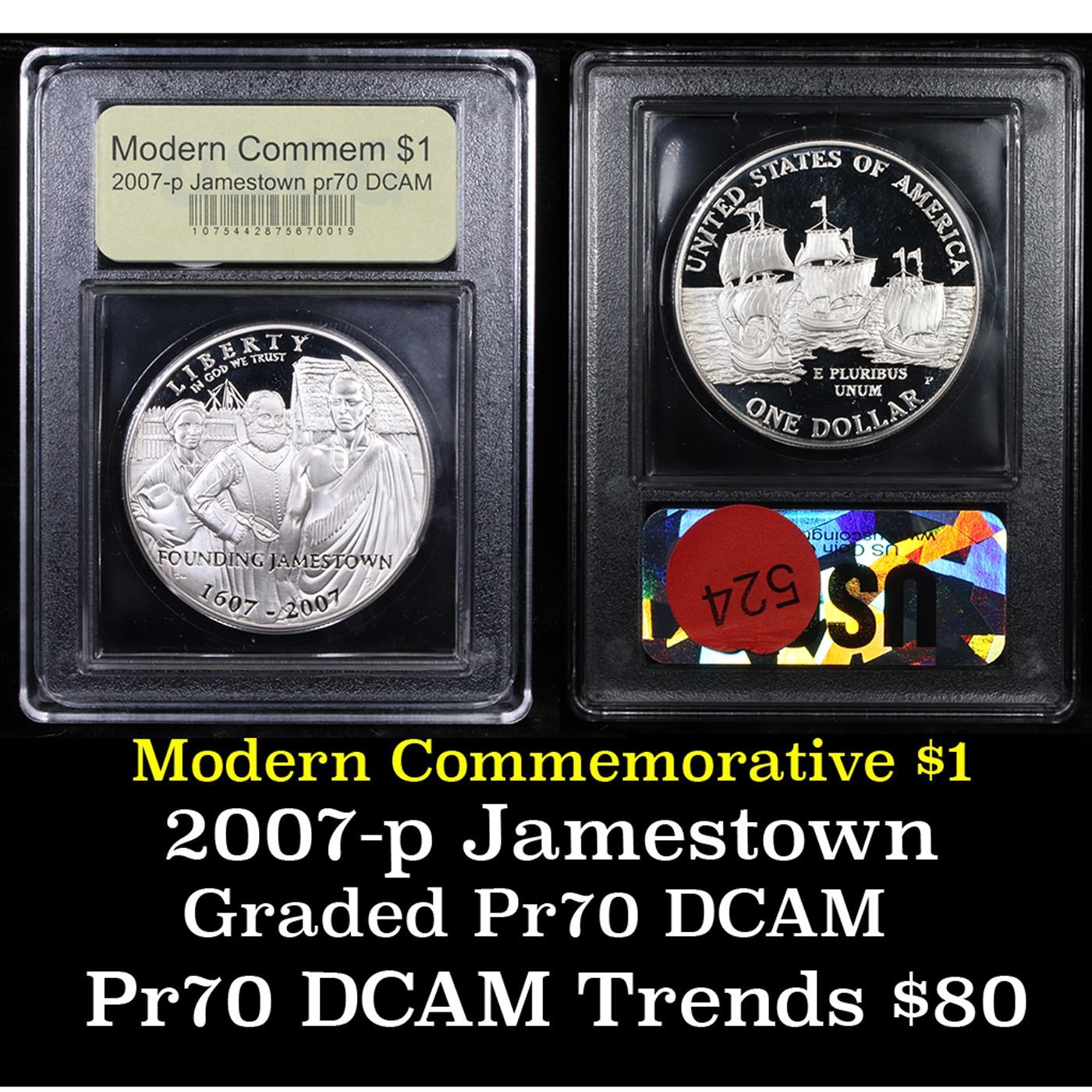 2007-P Jamestown Modern Commem Dollar $1 Graded GEM++ Proof Deep Cameo By USCG. The 2007 Jamestown Silver Dollar was issued to mark the 400th anniversary of the settlement at Jamestown, Virginia. Three ships, the Susan Constant, Godspeed, and Discovery carried 105 settlers to the New World to establish the first permanent English settlement in what would become America. This example is graded PR70 DCAM by USCG.