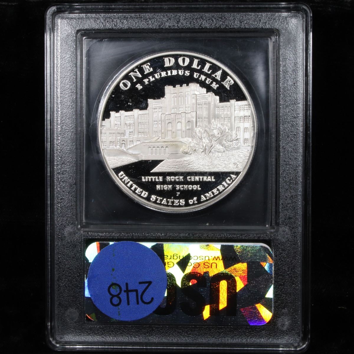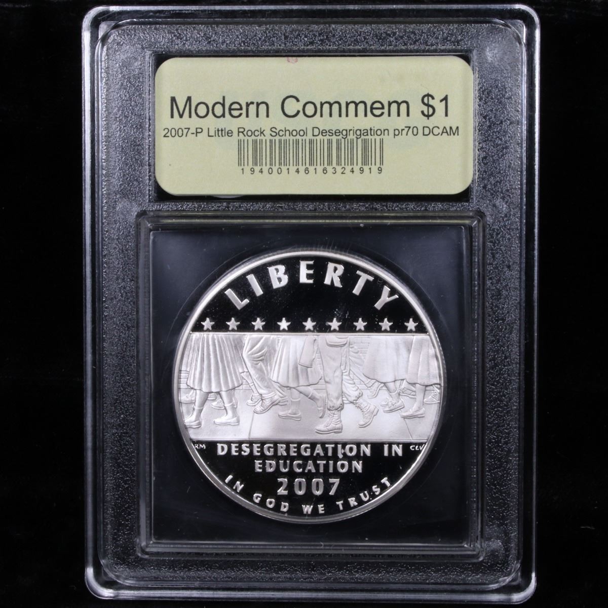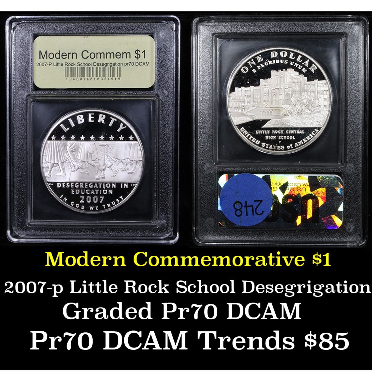 2007-P Little Rock Modern Commem Dollar $1 Graded GEM++ Proof Deep Cameo By USCG. The 2007 Little Rock Central High School Desegration Proof Silver Dollar Commemorative better known as the "Little Rock Nine" Commemorative was issued to commemorate the historic desegregation of Little Rock, Arkansas. This event took place with the landmark Supreme Court decision, Brown v. Board of Education. Nine students were chosen from the black school to begin the desegregation. The students were chosen based on their academic performance and attendance records. The importance of the Little Rock Nine was not just felt in Little Rock but worldwide. This example is graded PR70 DCAM by USCG.