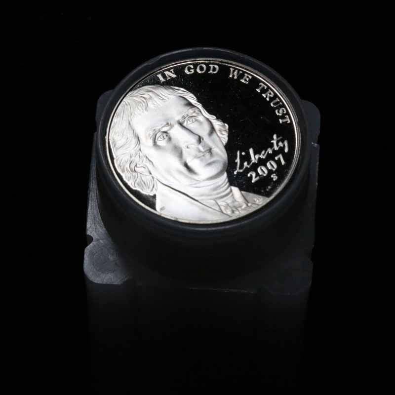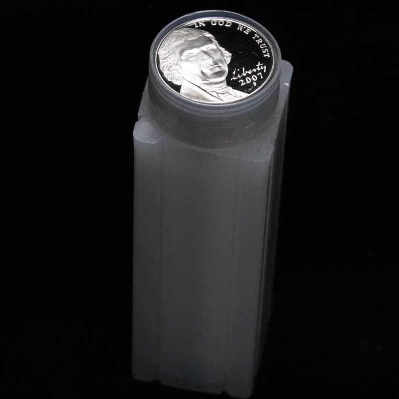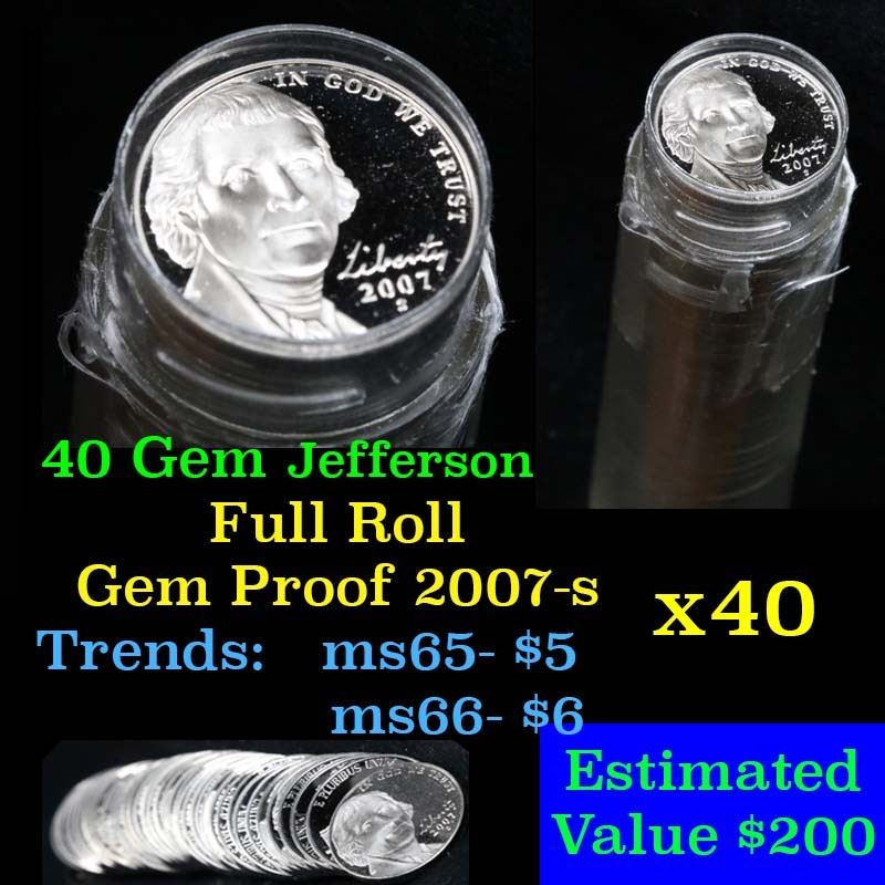 Proof 2007-s Jefferson nickel 5c roll, 40 pieces. A great proof roll of Jefferson nickels. All coins are deep cameo. In pr65dcam, it trends $5/coin, $200.