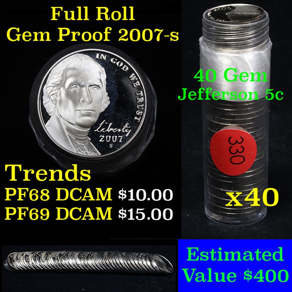Proof 2007-s Jefferson nickel 5c roll, 40 pieces. A great proof roll of Jefferson nickels. All coins are deep cameo. In pr68 DCAM $10/coin PR69 DCAM $15/coin. Estimate $400