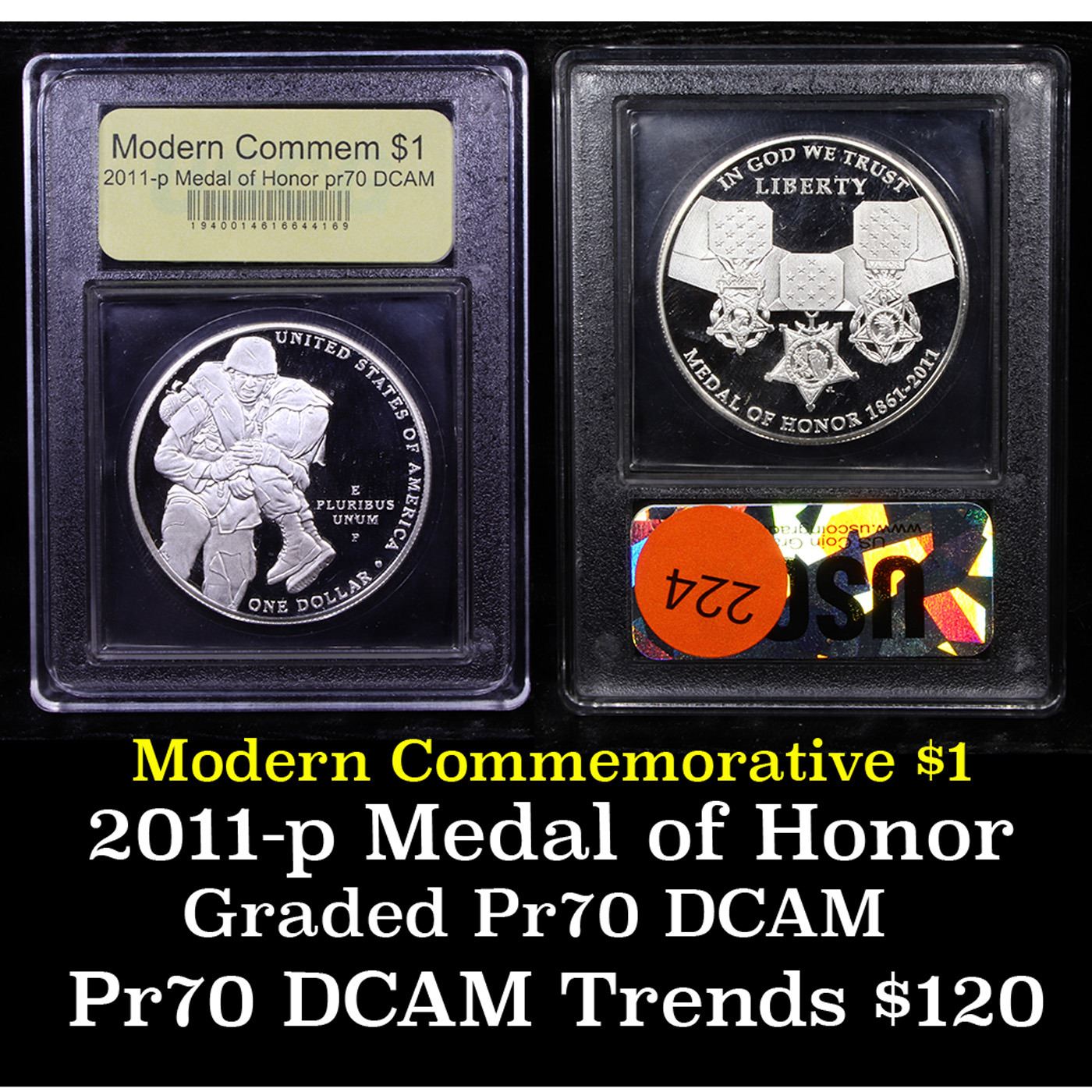 2011-P Medal Of Honor Modern Commem Dollar $1 Graded GEM++ Proof Deep Cameo By USCG. The 2011 Medal of Honor was issued in 2 designs as a Silver Dollar and $5 Gold. The obverse of the Medal of Honor Silver Dollar coin depicts three current Army, Navy and Air Force Medals of Honor, left to right. The ribbon with field of stars in the center is the common feature of all three medals, reflecting the joint nature of modern era warfare and the fact that the Medal of Honor is the only U.S. military medal worn around the neck. The reverse features a contemporary Army infantry soldier carrying a wounded soldier to safety under enemy fire, reflecting the courage and self-sacrifice of all Medal of Honor recipients. This image conveys the courage, selfless sacrifice and patriotism of Medal of Honor recipients, as well as the criteria established by Congress in 1963 requiring that all Medals of Honor be awarded. This Perfect coin is graded PR70 Deep cameo by USCG.