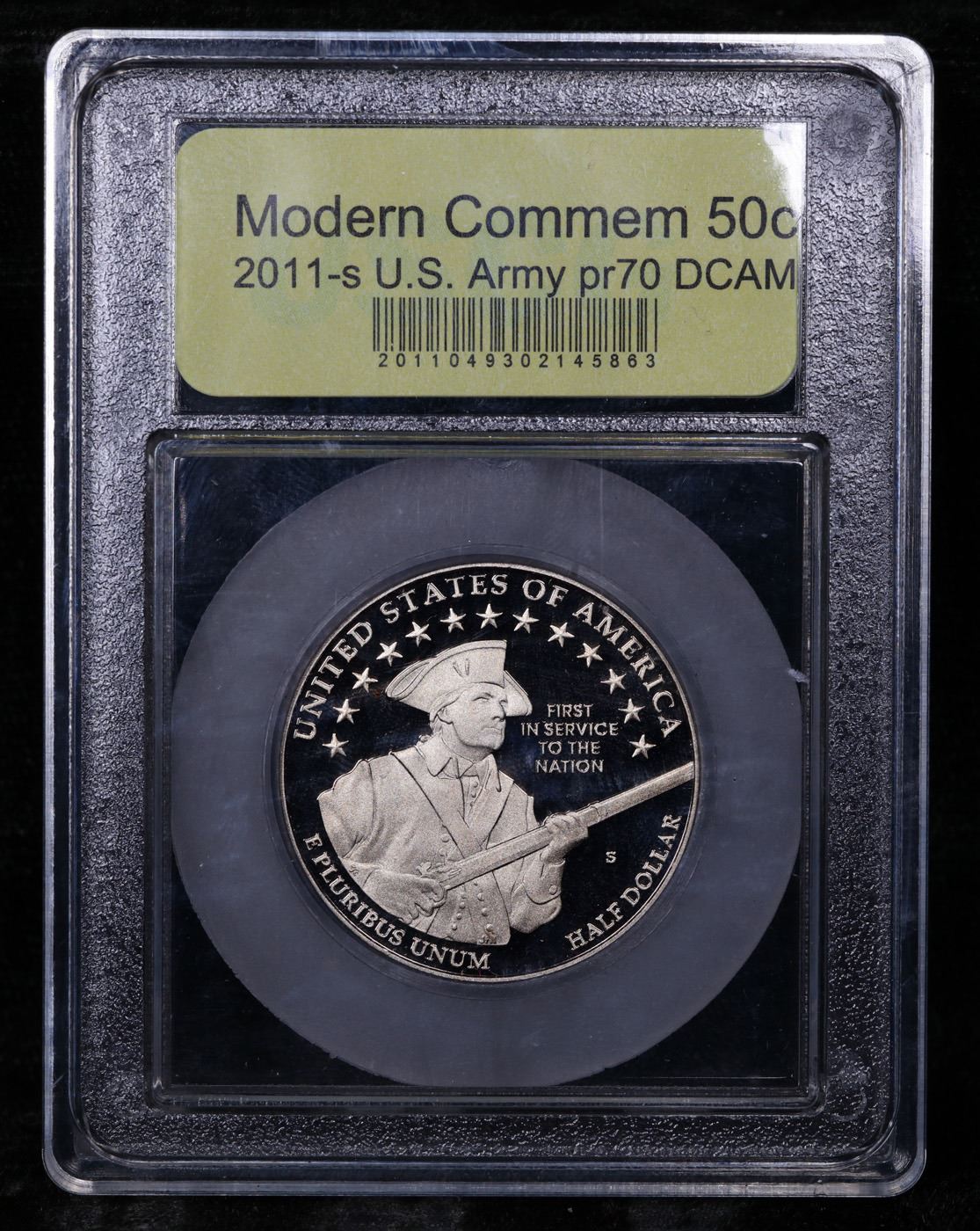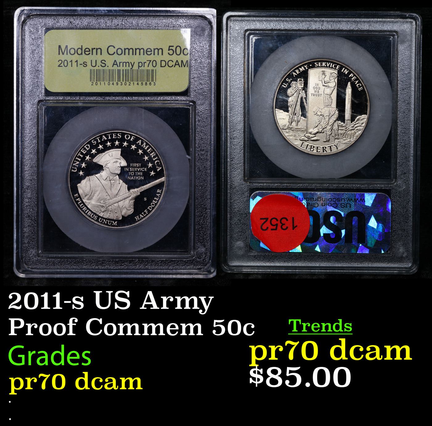 2011-S U.S. Army Modern Commem Half Dollar 50c Graded GEM++ Proof Deep Cameo By USCG. The 2011 United States Army commemorative was issued in 3 designs as a Half Dollar, Silver Dollar and $5 Gold. The obverse of the U.S. Army Half Dollar coin depicts three Army soldiers. One of the soldiers is surveying two other soldiers building a flood wall. The reverse features an enlisted Continental soldier armed with a musket and above him are 13 stars representing the original 13 colonies. The reverse of the coin represents the U.S. Army as the first military service defending the country and how the army has played a major role in the Nation's internal development. This Perfect coin is graded PR70 Deep cameo by USCG.