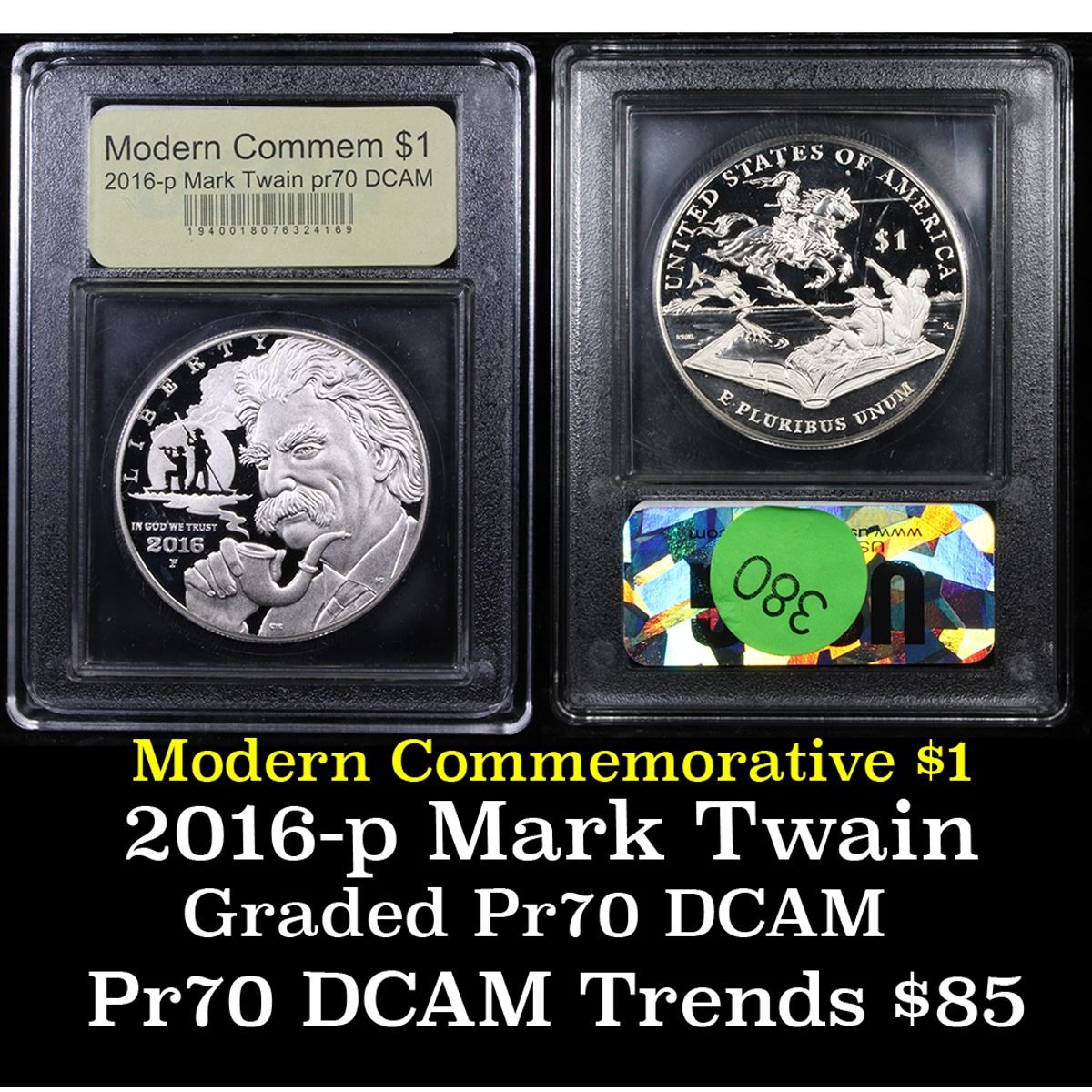2016-P Mark Twain Modern Commem Dollar $1 Graded GEM++ Proof Deep Cameo By USCG. Samuel Langhorne Clemens, better known by his pseudonym Mark Twain, was born in Florida, MO on November 30th, 1835. There are few American authors who have influenced the nation's culture more than Twain. Almost all of his books are still and print and have been translated into 75 languages. His books offer a window into the tumultuous period following the Civil War and show the vast economic inequalities of the Gilded Age.