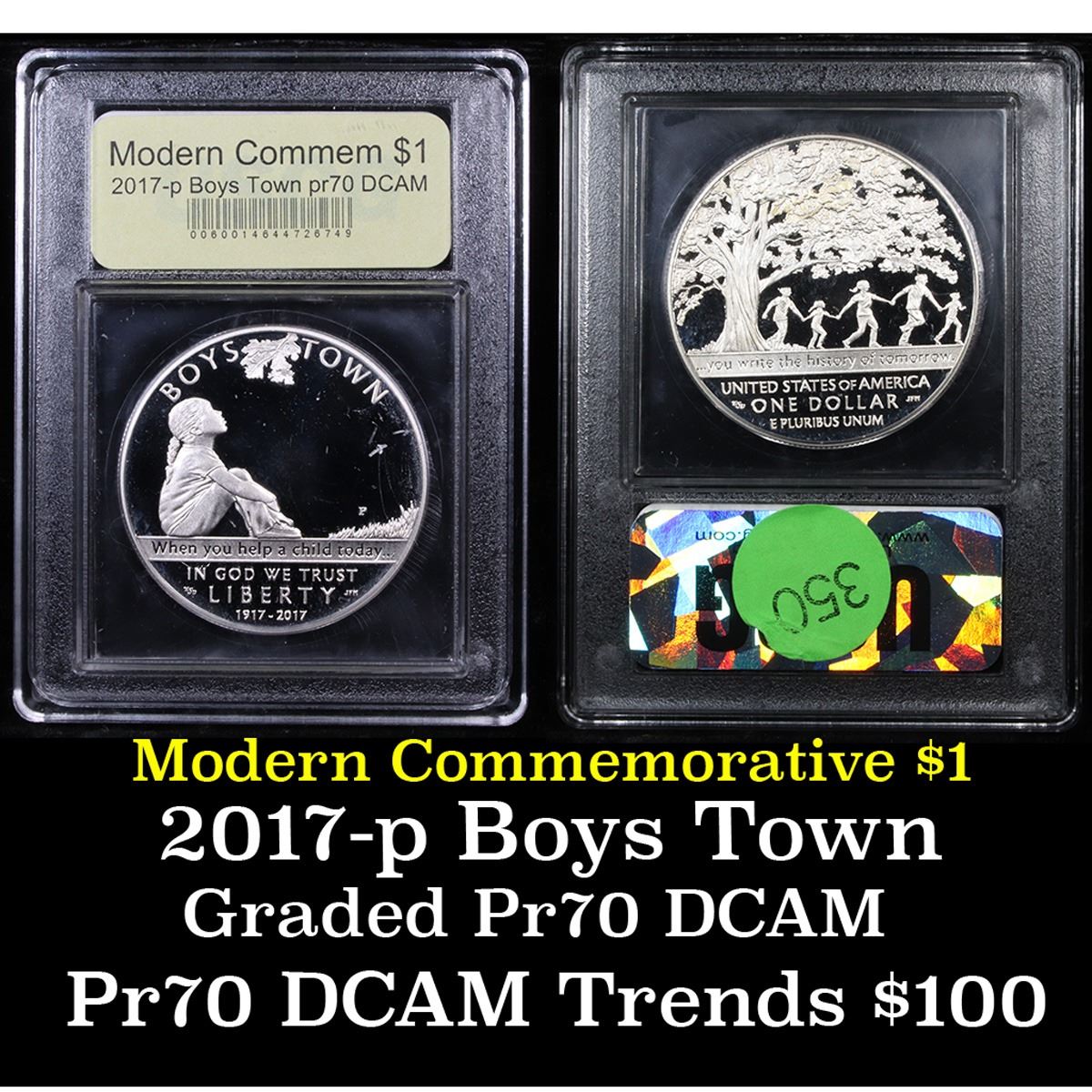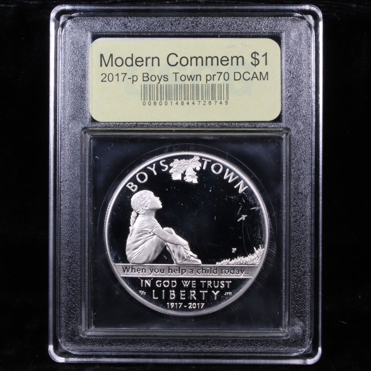 2017-P Boys Town Centennial Modern Commem Dollar $1 Graded GEM++ Proof Deep Cameo By USCG. Silver dollar obverses show a young girl sitting alone and gazing upward into the branches of an oak tree. Inscriptions read "BOYS TOWN," "When you help a child today…," "IN GOD WE TRUST," "LIBERTY," and "1917-2017." AIP Designer Emily Damstra created the design and Mint Sculptor-Engraver Joseph Menna sculpted it. $1 coin reverses feature an oak tree offering shelter and a sense of belonging to a family seen holding hands below it. Damstra and Menna are also responsible for its design and sculpting which incorporates the inscriptions of "…you write the history of tomorrow," "UNITED STATES OF AMERICA," "ONE DOLLAR," and "E PLURIBUS UNUM."