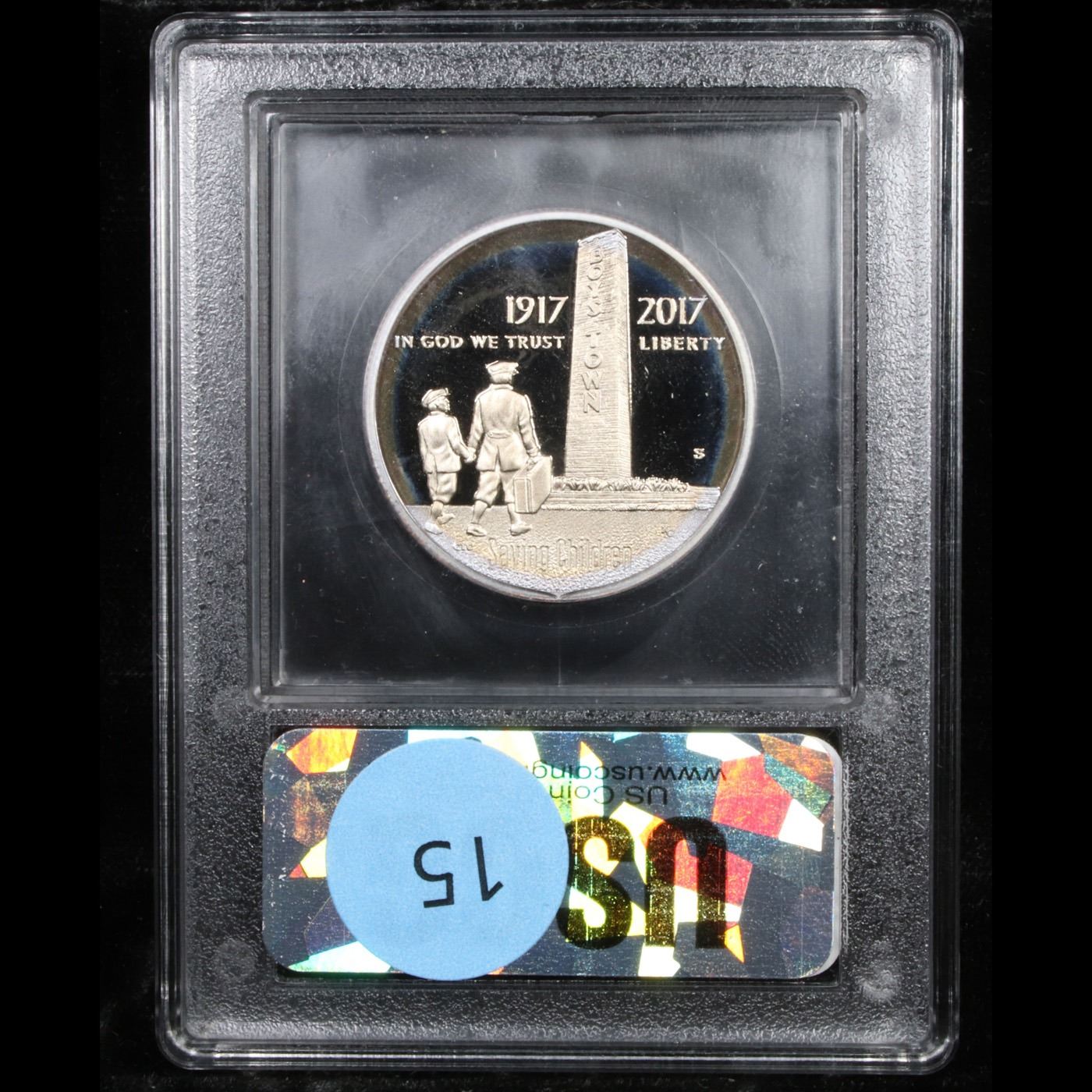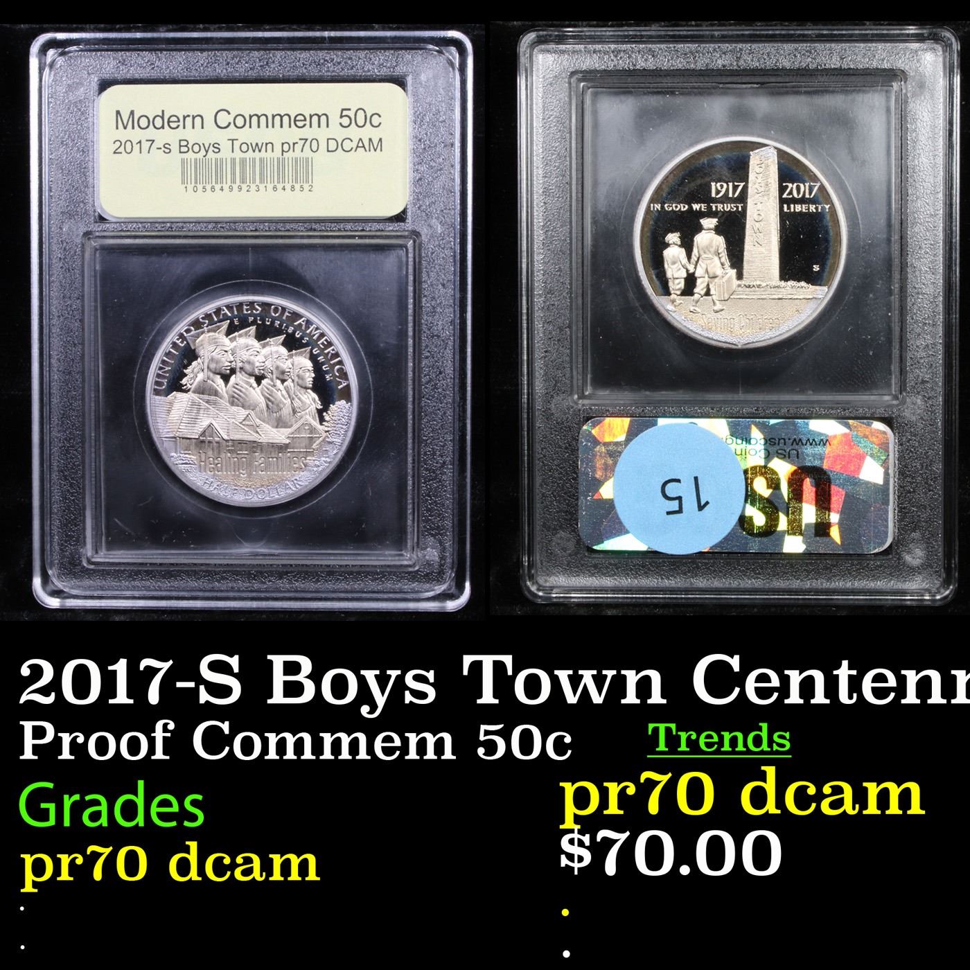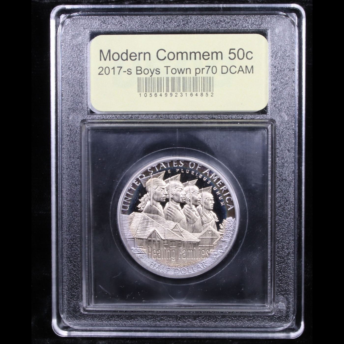 2017-S Boys Town Centennial Modern Commem Half Dollar 50c Graded GEM++ Proof Deep Cameo By USCG. Obverse: Features an older brother holding the hand of his younger brother in 1917. They walk toward Father Flanagan’s Boys Home and the 1940s Pylon representing what would become Boys Town. Inscriptions include “BOYS TOWN,” “1917,” “2017,” “IN GOD WE TRUST,” “LIBERTY,” and “Saving Children.” Reverse: Features a present–day Boys Town neighborhood of homes where children are schooled and nurtured by caring families. Out of these homes come young adults who graduate from high school and the Boys Town program. Inscriptions include “UNITED STATES OF AMERICA,” “E PLURIBUS UNUM,” “Healing Families,” and “HALF DOLLAR.”