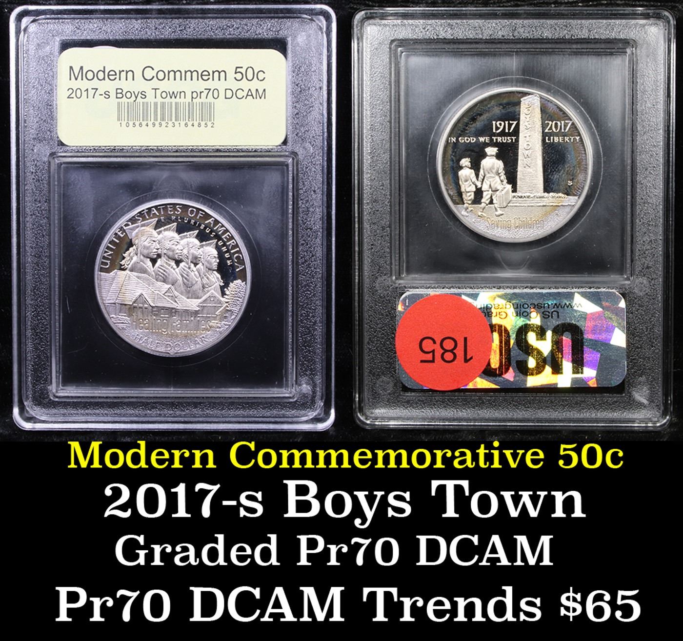 2017-S Boys Town Centennial Modern Commem Half Dollar 50c Graded GEM++ Proof Deep Cameo By USCG. Obverse: Features an older brother holding the hand of his younger brother in 1917. They walk toward Father Flanagan’s Boys Home and the 1940s Pylon representing what would become Boys Town. Inscriptions include “BOYS TOWN,” “1917,” “2017,” “IN GOD WE TRUST,” “LIBERTY,” and “Saving Children.” Reverse: Features a present–day Boys Town neighborhood of homes where children are schooled and nurtured by caring families. Out of these homes come young adults who graduate from high school and the Boys Town program. Inscriptions include “UNITED STATES OF AMERICA,” “E PLURIBUS UNUM,” “Healing Families,” and “HALF DOLLAR.”