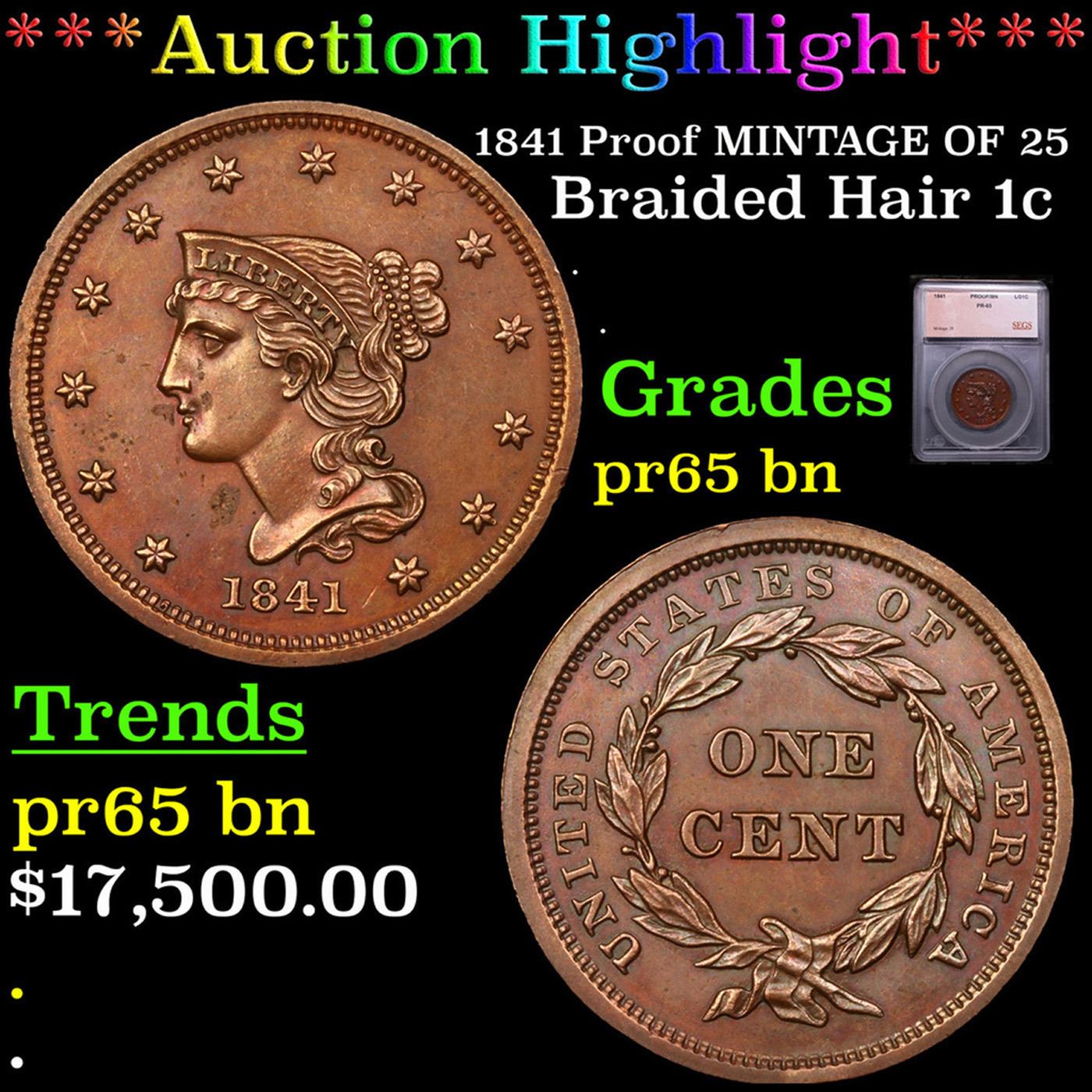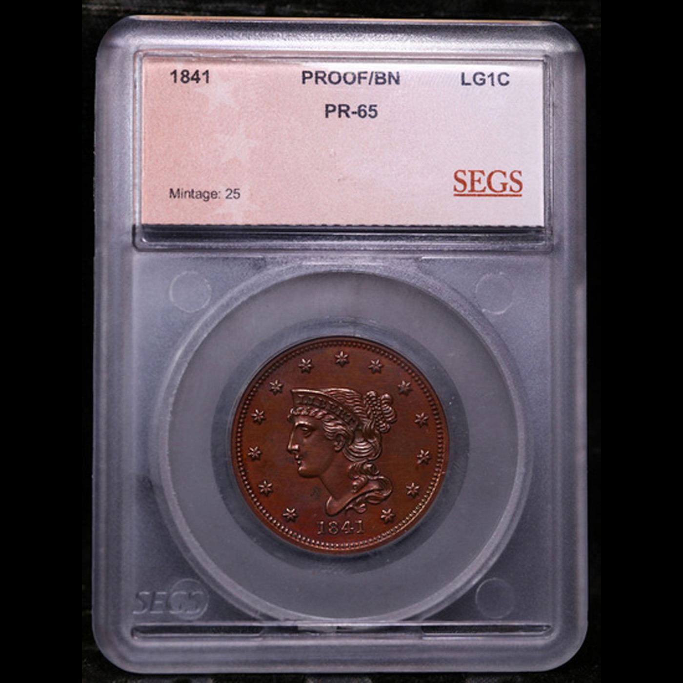 ***Auction Highlight*** 1841 Proof MINTAGE OF 25 Braided Hair Large Cent 1c Graded pr65 bn BY SEGS. A Corey's Pick, Bid to Win, Don't let it get Away, you might not find its equal Coin. I give this coin my highest recommendation