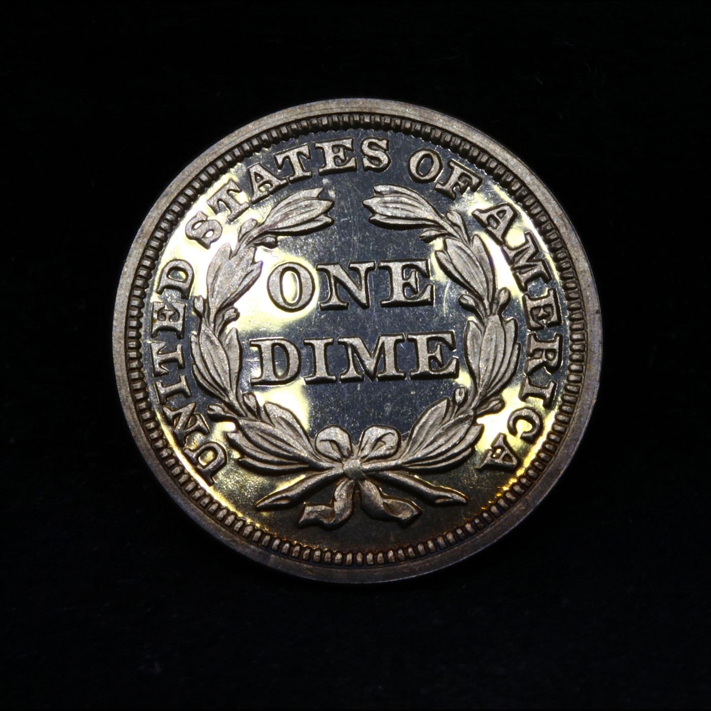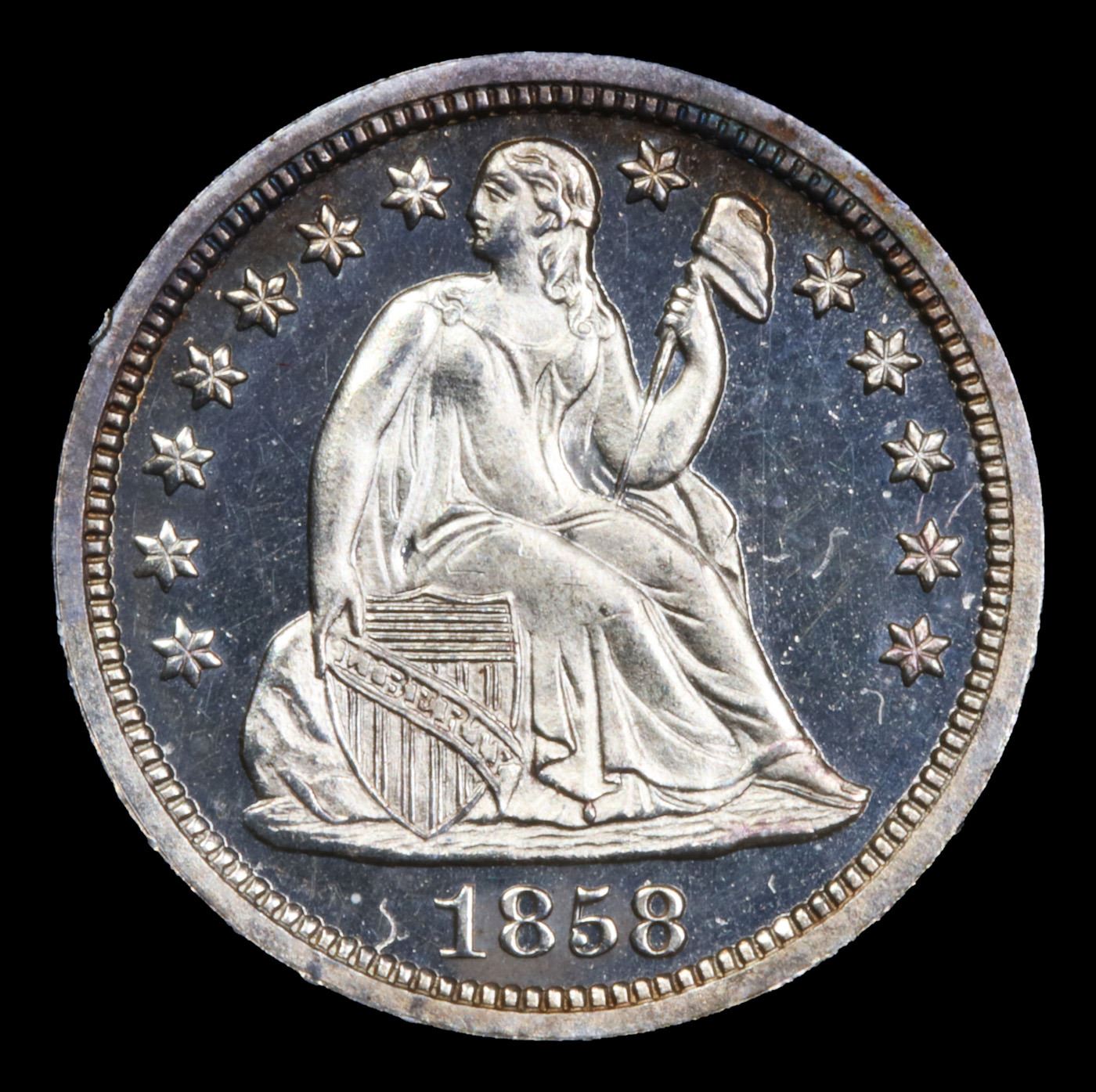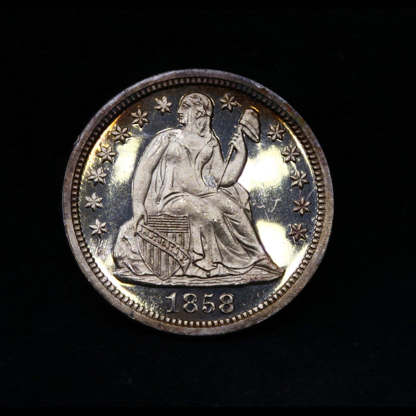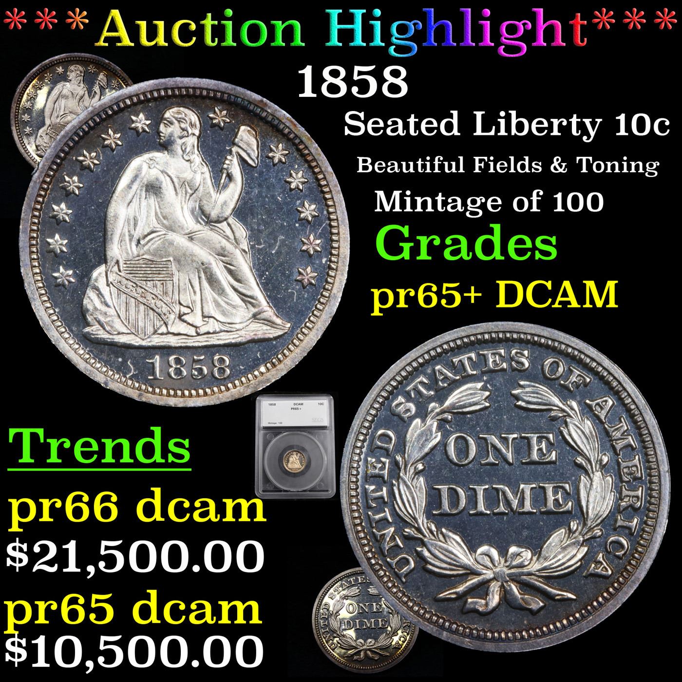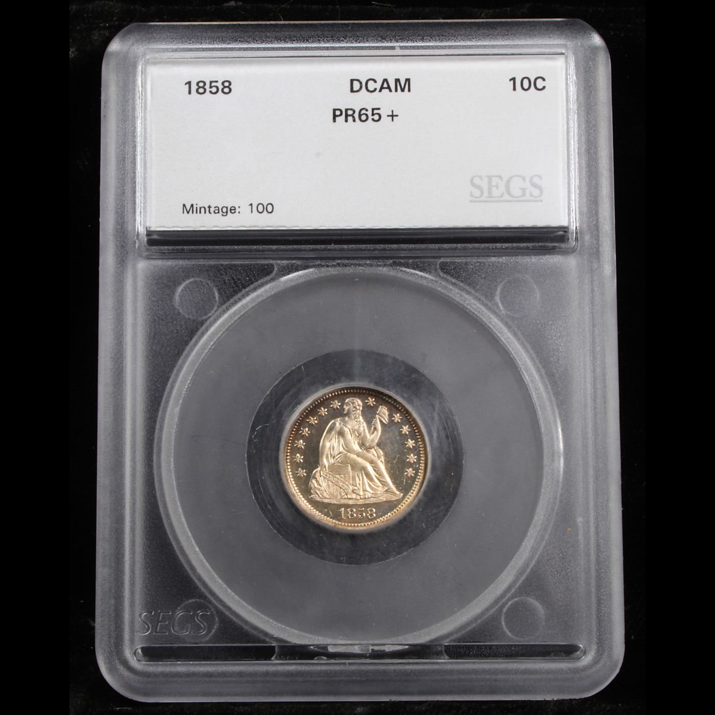 ***Auction Highlight*** 1858 Seated Liberty Dime 10c Graded pr65+ DCAM By SEGS. Struck in the first year of wide spread distribution to collectors, this amazing proof survives from a small but unknown mintage. As collecting gained in popularity, the Mint began marketing coins to those collectors, especially proof coins and patterns. During this period, many restrikes of older rarities began making their appearance, including 1804 dollars, Gobrecht dollars, and many others. The U.S. Mint quickly became an active coin dealer, a role the agency continues today.The sole 1858 proof marriage, per Gerry Fortin. Per PCGS the original mintage was just 100 coins, But Breen says that number was closer to 80. Nicely struck and flashy with Deep stark contrast. The only Known Deep Cameo example, on a date that is generally unavailable with any contrast. Trends are hard to assess as no other DCAM has ever come to auction. If we look at the 1859, in Cameo the pr65 trends $3500, and in DCAM $8500, but on the 1859, about 3-4 examples are known in DCAM. On the 1858, in pr65 Cameo the coin trends $4500 and in pr66 cam $9,000. So we estimate that in pr65 DCAM the trends should be $10,500 and in pr66 DCAM $21,500. A Corey's Pick, Bid to Win, Don't let it get Away, you might not find its equal Coin. I give this coin my highest recommendation