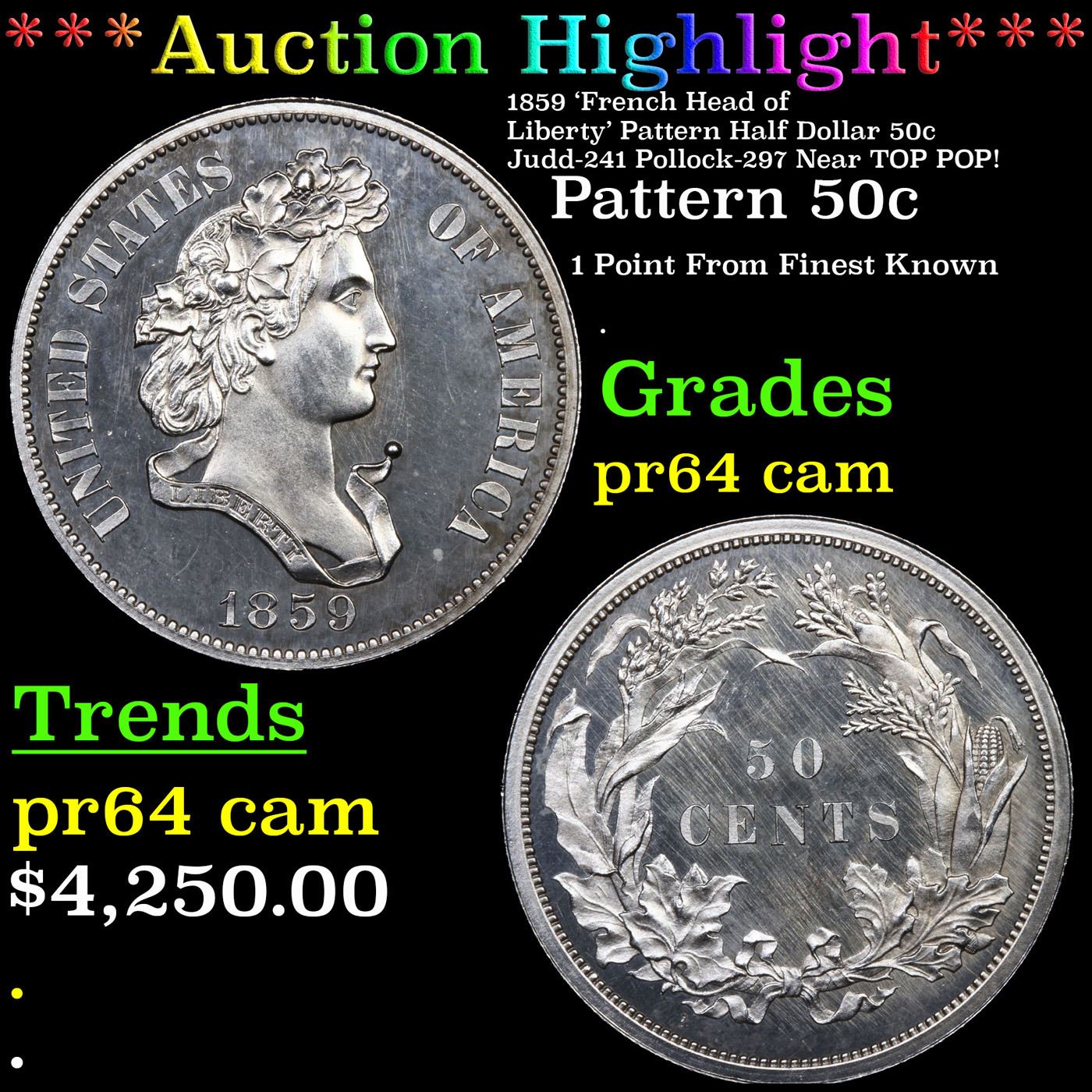 ***Auction Highlight*** 1859 'French Head of Liberty' Pattern Half Dollar 50c Judd-241 Pollock-297 Near TOP POP! Graded pr64 cam BY SEGS. James Longacre's so-called "French Head of Liberty" design for the half dollar. It is uncertain where the "French Head" name came from, as the portrait is obviously modeled after the Apollo Belvedere in Rome. The reverse displays 50 CENTS encompassed by a cereal wreath that is very similar to that introduced on the issued 1860 Seated dime, although much larger in scale. Struck in silver with a reeded edge. Both silver and copper examples were struck with from this die pairing. It is believed that around 50 silver examples exist today. This is an all-brilliant example with good depth of reflectivity in the fields and thick mint frost over the devices. A Corey's Pick, Bid to Win, Don't let it get Away, you might not find its equal Coin. I give this coin my highest recommendation