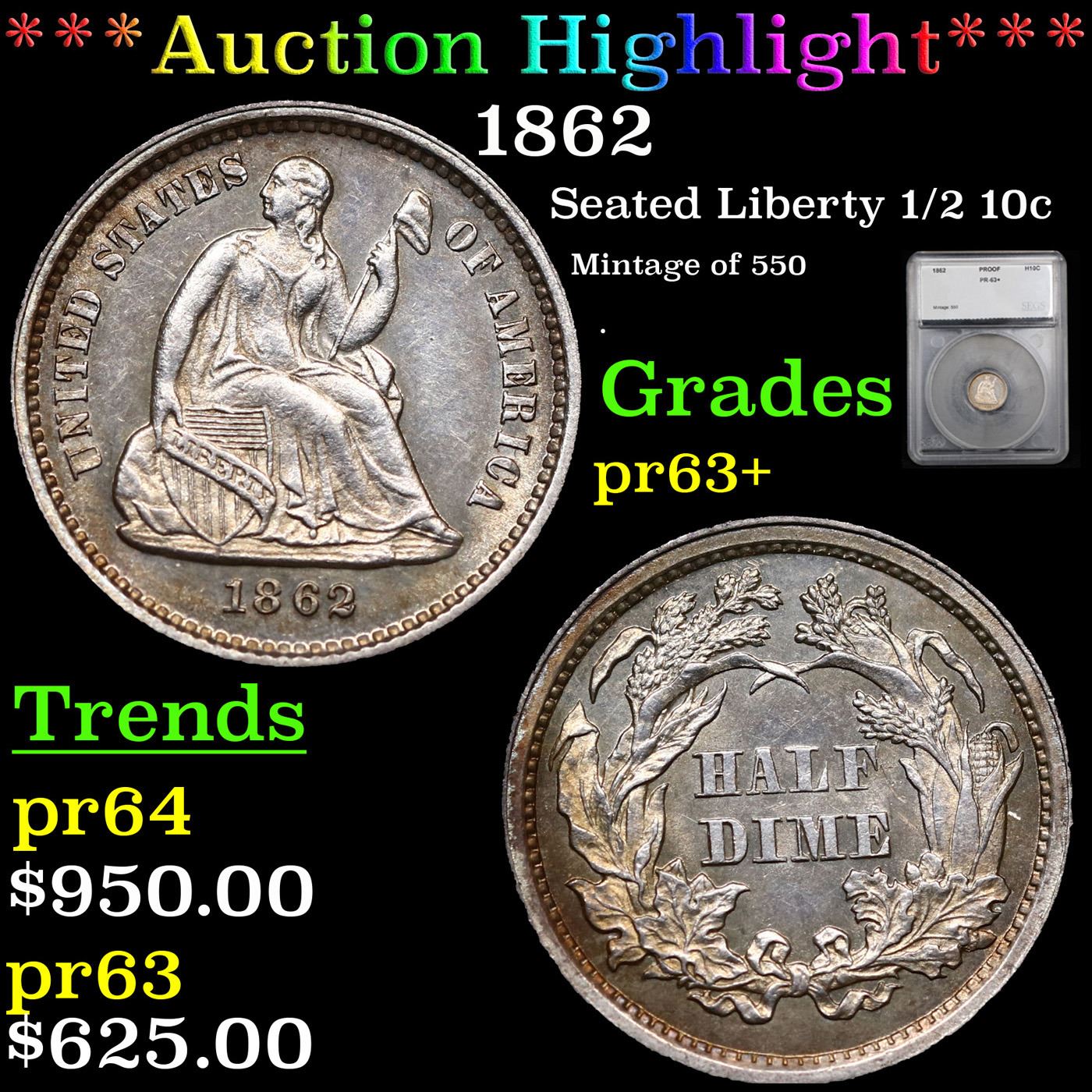 ***Auction Highlight*** 1862 Seated Liberty Half Dime 1/2 10c Graded pr63+ By SEGS.