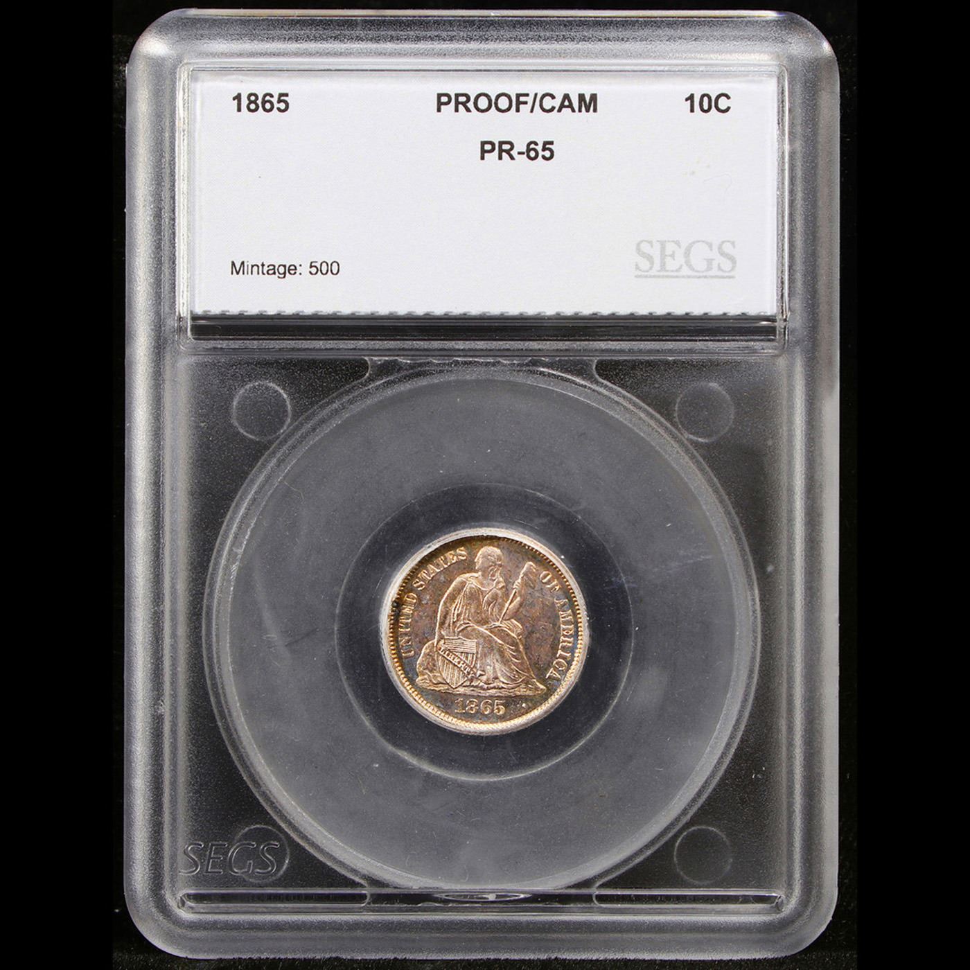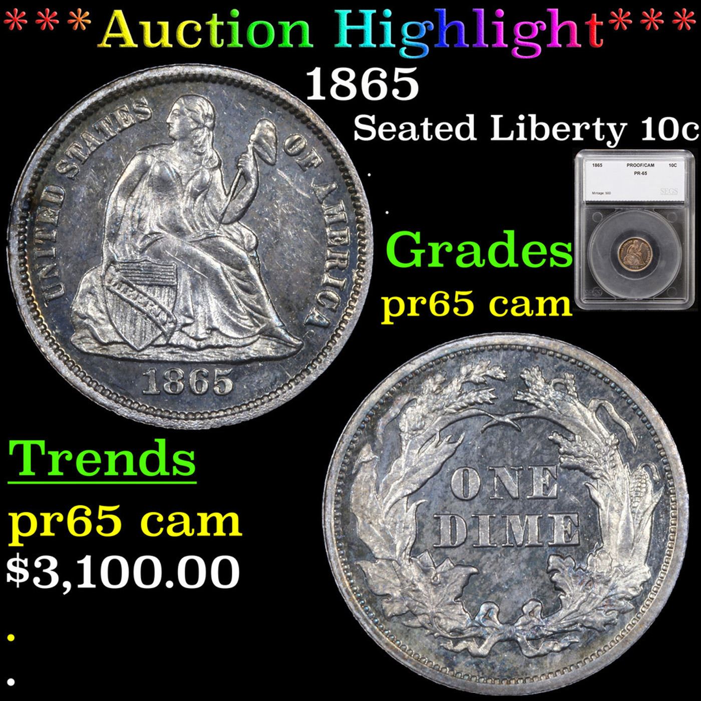 ***Auction Highlight*** 1865 Seated Liberty Dime 10c Graded pr65 cam By SEGS.