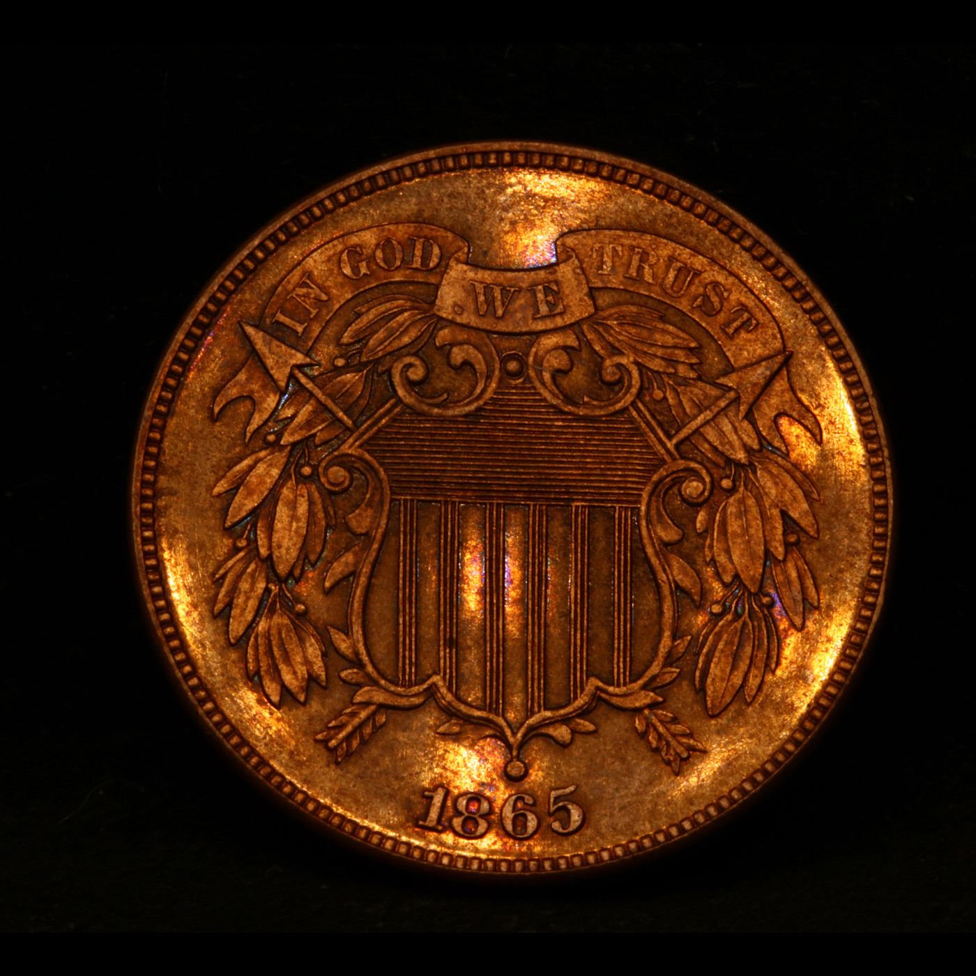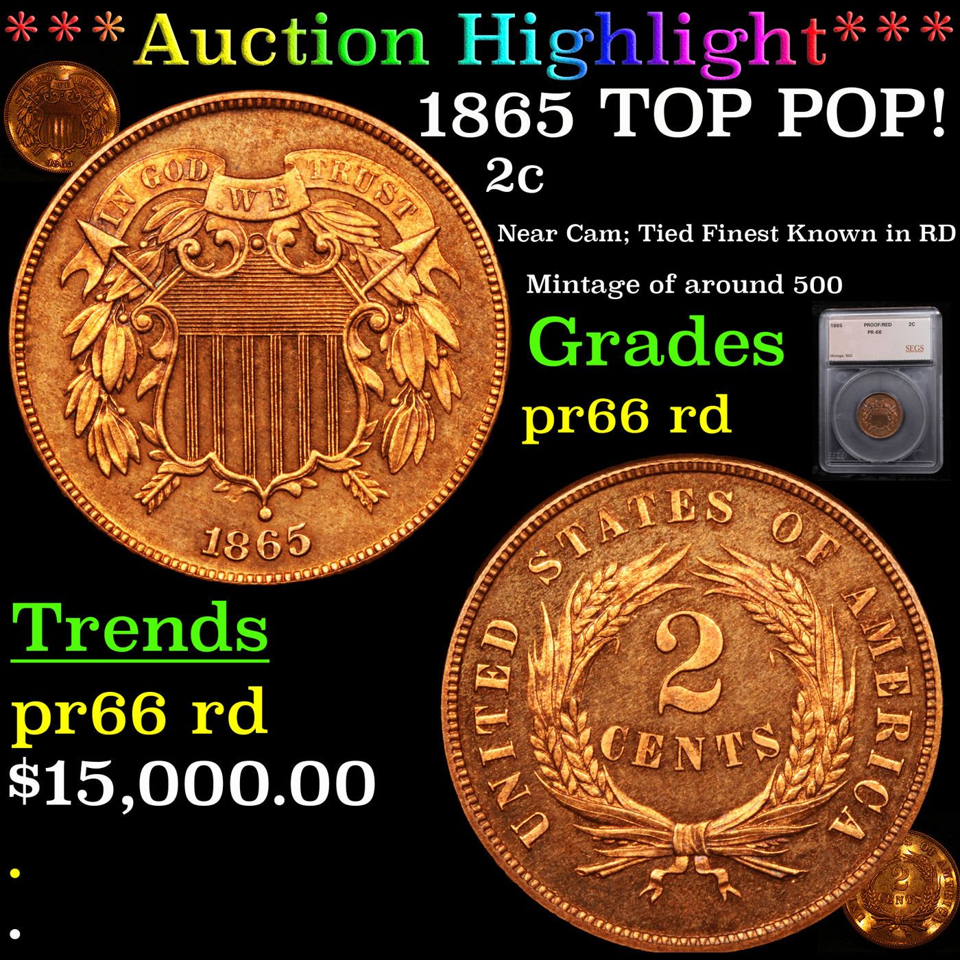 ***Auction Highlight*** 1865 TOP POP! Two Cent Piece 2c Graded pr66 rd By SEGS. The reported mintage for the 1865 proof two cent is 500+ pieces, but no official tallies were kept for minor proof coinage at that time. Most pieces that come to market have lost their original red coloration and display deeper brown or red-brown patina.This spectacular Premium Gem two cent proof is a delightful exception. Each side is copper and amber-gold with magenta accents and strong field reflectivity. The strike is absolutely razor-sharp, as expected. This marvelously preserved offering would serve as a highlight in any set. Among the finest in this category I have included 1 example for your comparison in Red A Corey's Pick, Bid to Win, Don't let it get Away, you might not find its equal Coin. I give this coin my highest recommendation