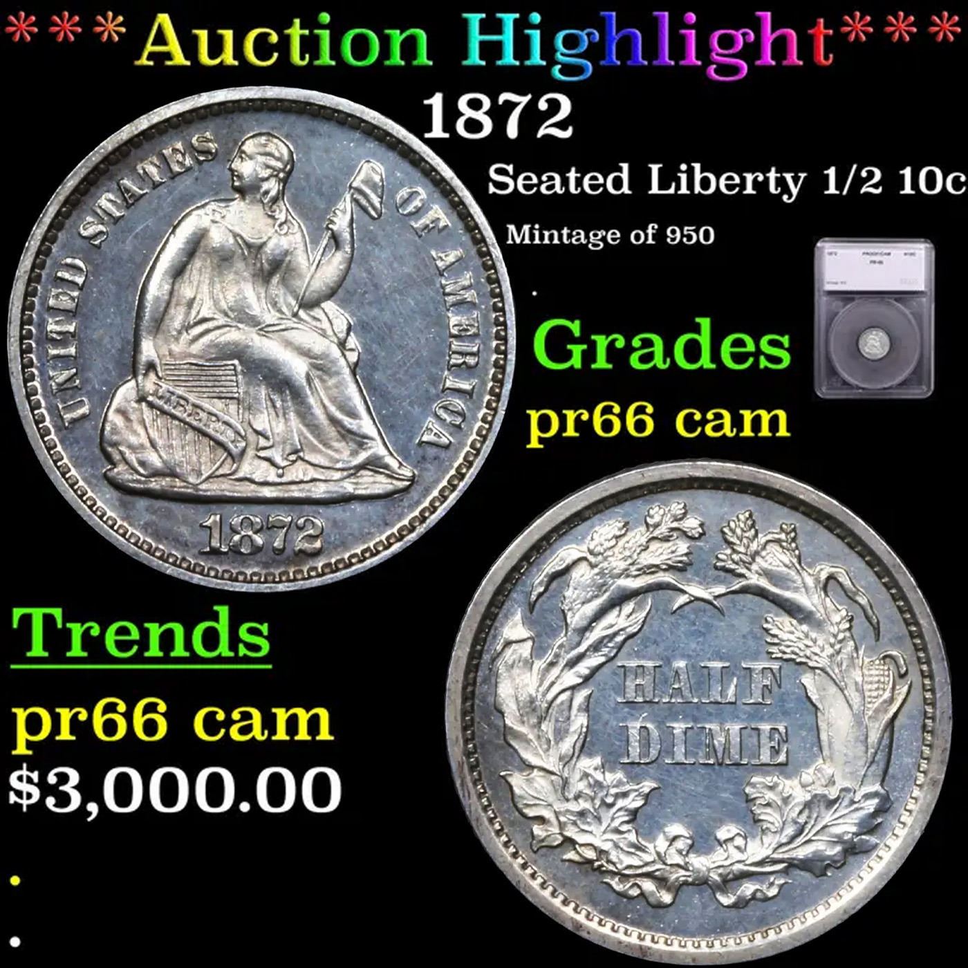 ***Auction Highlight*** 1872 Seated Liberty Half Dime 1/2 10c Graded pr66 cam By SEGS. A Key Date's Pick, Bid to Win, Don't let it get Away Coin