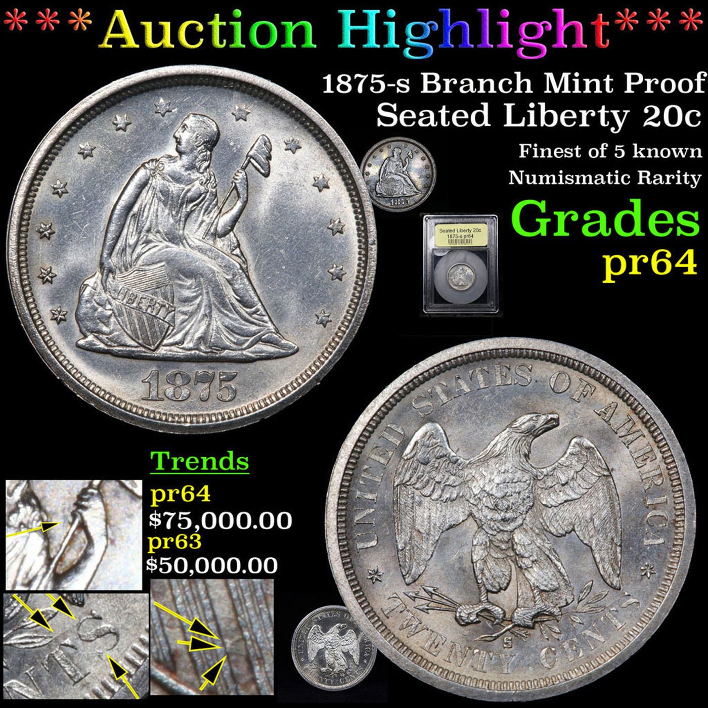 ***Auction Highlight*** 1875-s Branch Mint Proof Twenty Cent Piece 20c Graded Choice Proof By USCG. Numismatic Rarity alert! Up for auction is one of the rarest 20c pieces to have survived. With less than 5 known. This is the legendary 1875-s Special Strike Issue. It is known that the San Francisco mint made 12 of these in 1875. Per PCGS “Jaime Hernandez: The 1875-S Special Strike 20 Cent Piece is definitely a great rarity in numismatics. There is very little information about this coin but one thing is for certain, it is unquestionably a special coin. The coins may have been struck to celebrate the first 20 Cent Pieces struck at the San Francisco Mint, as Branch Mint's at times struck examples to celebrate special occasions. Such as a first year, last year of issue coins or first year denominations, etc. The characteristics of the 1875-S 20 Cent Piece coins display a bold strike and have overall great detail. The rims also tend to be very sharply struck. Some experts believe a dozen or so exist, however, far fewer examples have actually been confirmed.” The discovery coin was made by Walter Breen at the 1964 ANA. The diagnostics were first published in an article by Roy Rauch in The Gobrecht Journal in 1974. The diagnostics he listed are: three horizontal scratches in the bars of the shield and a small triangular die chip very near the staff just below the hand. On the reverse, there is a small scratch from the bottom leaf above the T in CENTS to the S in CENTS, and there is pronounced separation from overzealous die polishing on the bottom serif of the S in CENTS. All these diagnostics are present on our coin! Additionally, the example at hand has a bold strike, differing from all other 20c pieces I’ve ever encountered. It has incredibly sharp rims and the Liberty on the Shield matches perfectly to the one certified by PCGS. It has mirrored fields and no known Proof Like 1875-s are known. A True numismatic rarity. The last to go to auction was in 2002, and it sold for $32,000. A cameo went to auction in 2004 and sold for $104,000. Good Luck on obtaining this Near unique example. A Corey's Pick, Bid to Win, Don't let it get Away, you might not find its equal Coin. I give this coin my highest recommendation