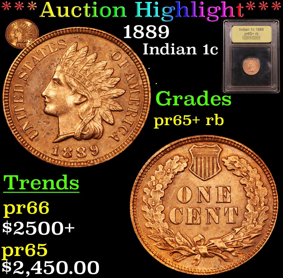 ***Auction Highlight*** 1889 Indian Cent 1c Graded GEM+ rb Proof By USCG. Up for auction is a 1889 Proof Indian Cent; Vivid orange-gold surfaces exhibit remarkably reflective surfaces and frosted devices, with contrast that flirts inconceivably close to a Cameo designation. Sharply struck and attractive. A Corey's Pick, Bid to Win, Don't let it get Away, you might not find its equal Coin