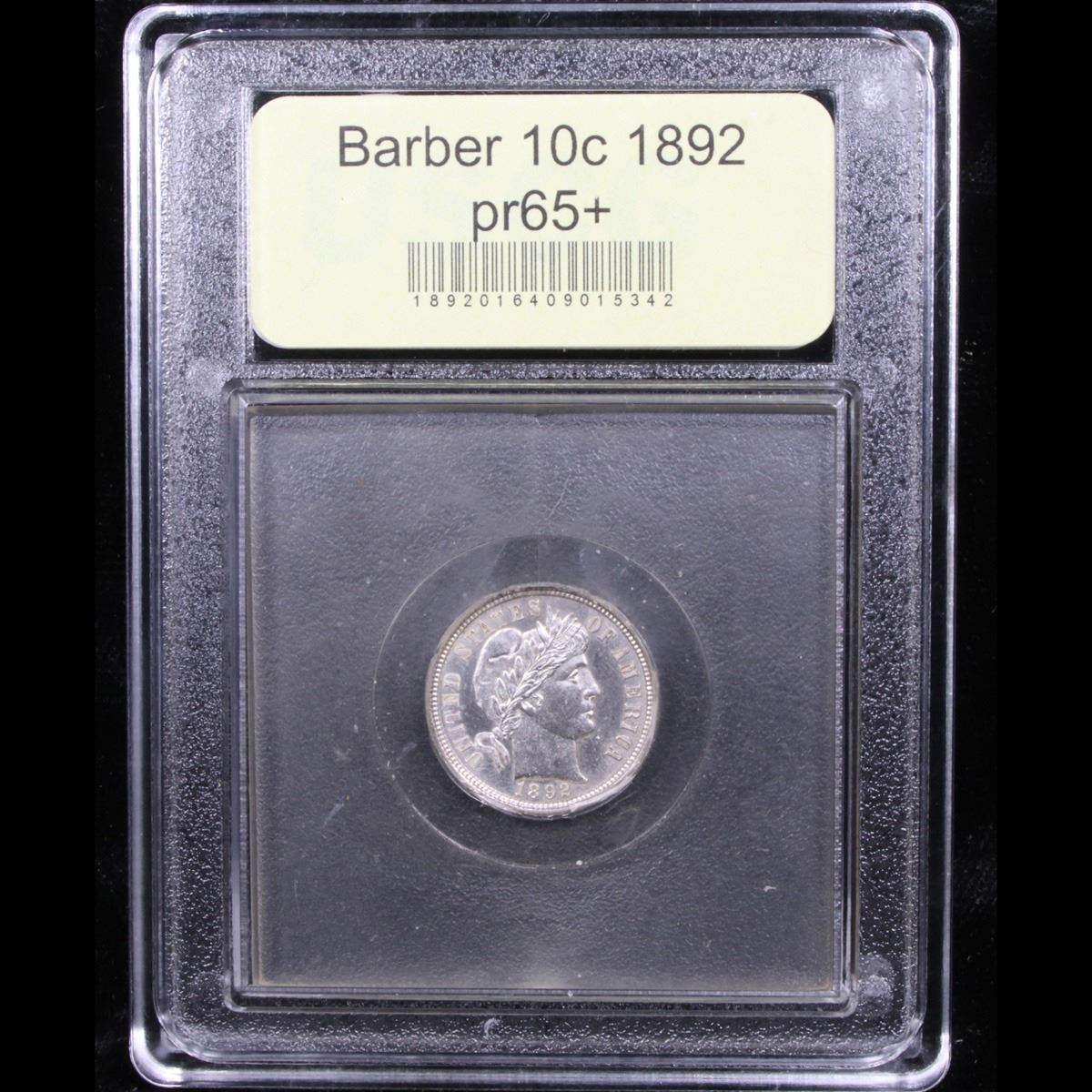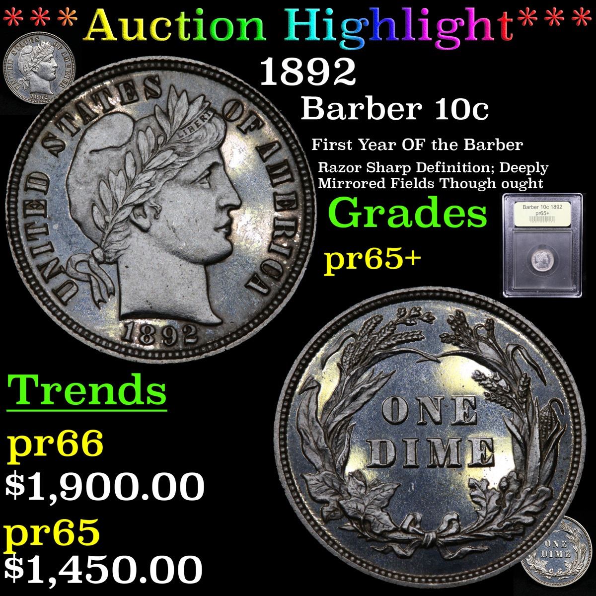 ***Auction Highlight*** 1892 Barber Dime 10c Graded GEM+ Proof BY USCG. From a generous proof mintage of 1,245 pieces, this spectacular Superb Gem represents the first year of the Barber design. The design elements exhibit razor-sharp definition and the fields are deeply reflective throughout. A Corey's Pick, Bid to Win, Don't let it get Away Coin