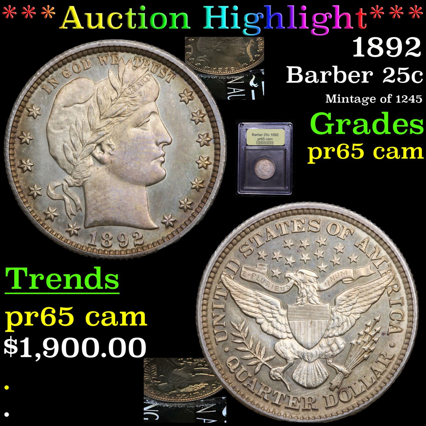***Auction Highlight*** 1892 Barber Quarter 25c Graded GEM Proof Cameo By USCG. A Corey's Pick, Bid to Win, Don't let it get Away Coin