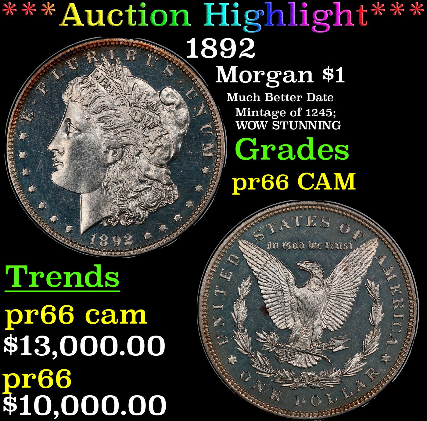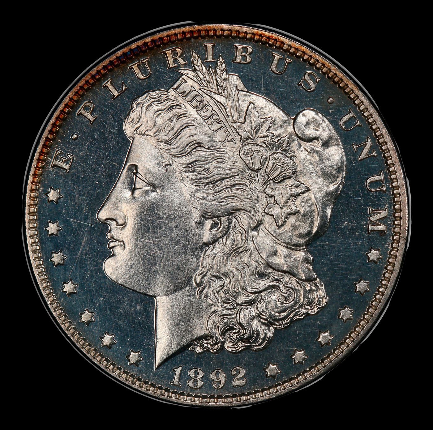 ***Auction Highlight*** 1892 Morgan Dollar $1 Grades pr66 CAM By SEGS. The proof coinage of 1892 is known for its somewhat elevated production levels. Mintages increased with the expectation that the introduction of the new Barber coinage would spur demand for proof sets. This is one of 1,245 proof Morgan dollars struck that year. It features faint golden accents around brilliant surfaces. The reverse Has a patch of violet color along the edge of the eagle's left wing A Key Date's Pick, Bid to Win, Don't let it get Away, you might not find its equal Coin. I give this coin my highest recommendation
