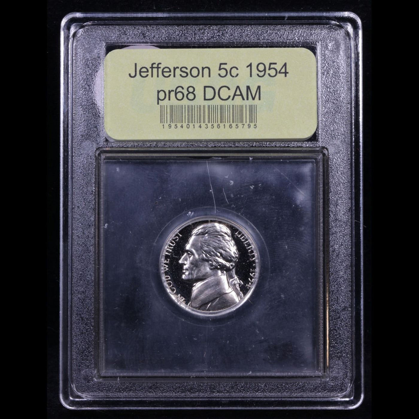 ***Auction Highlight*** 1954 Proof Jefferson Nickel 5c Graded GEM++ Proof Deep Cameo By USCG. Up for Auction is a Numismatic Rarity and a slice of near perfection. A magnificent PR68 Jefferson nickel, this piece possesses profound cameo contrast, unusual in proofs of the mid-1950s. The devices display pinpoint definition throughout, and the fields appear pristine. Near Top Pop, Tied for 2nd finest. 13 graded 68 dcam and 1 in 68+ dcam. I’ve included 2 pr68 dcam examples in pcgs holders. The two sold at auction in 2017, one for $1590 and one for $1763. Trends list pr68 dcam at $2200 A Corey's Pick, Bid to Win, Don't let it get Away, you might not find its equal Coin