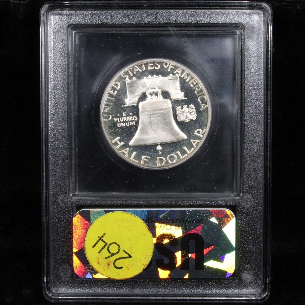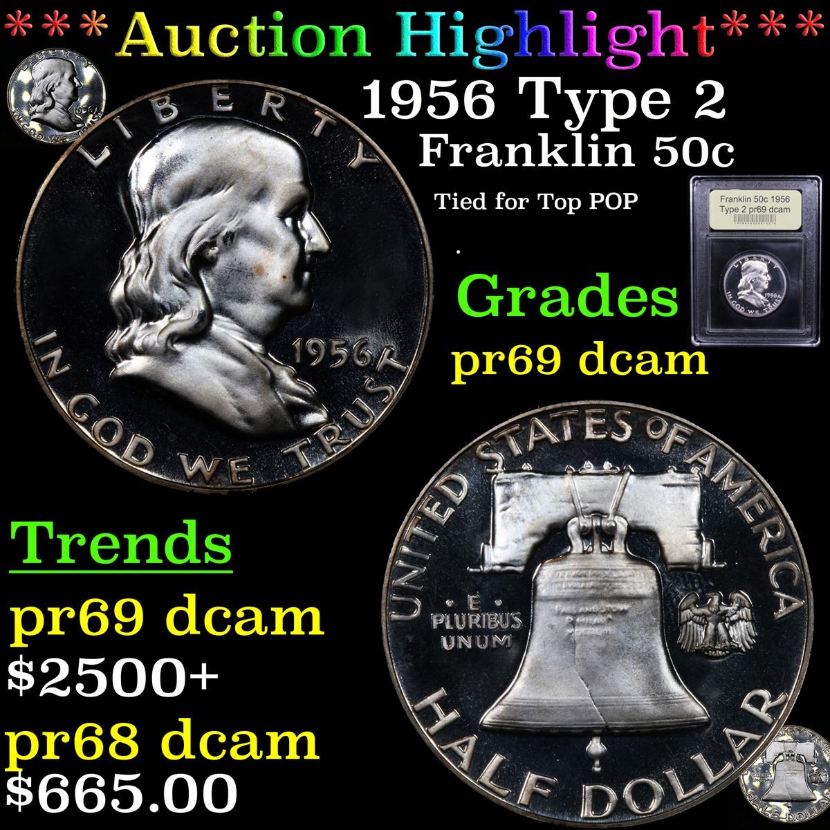 ***Auction Highlight*** 1956 Type 2 Franklin Half Dollar 50c Graded GEM++ Proof Deep Cameo BY USCG. The normal reverse for the year with three bold feathers left of the eagle's perch. This black-and-white PR69 half dollar presents eye-catching Deep Cameo contrast and is virtually flawless. A Corey's Pick, Bid to Win, Don't let it get Away, you might not find its equal Coin