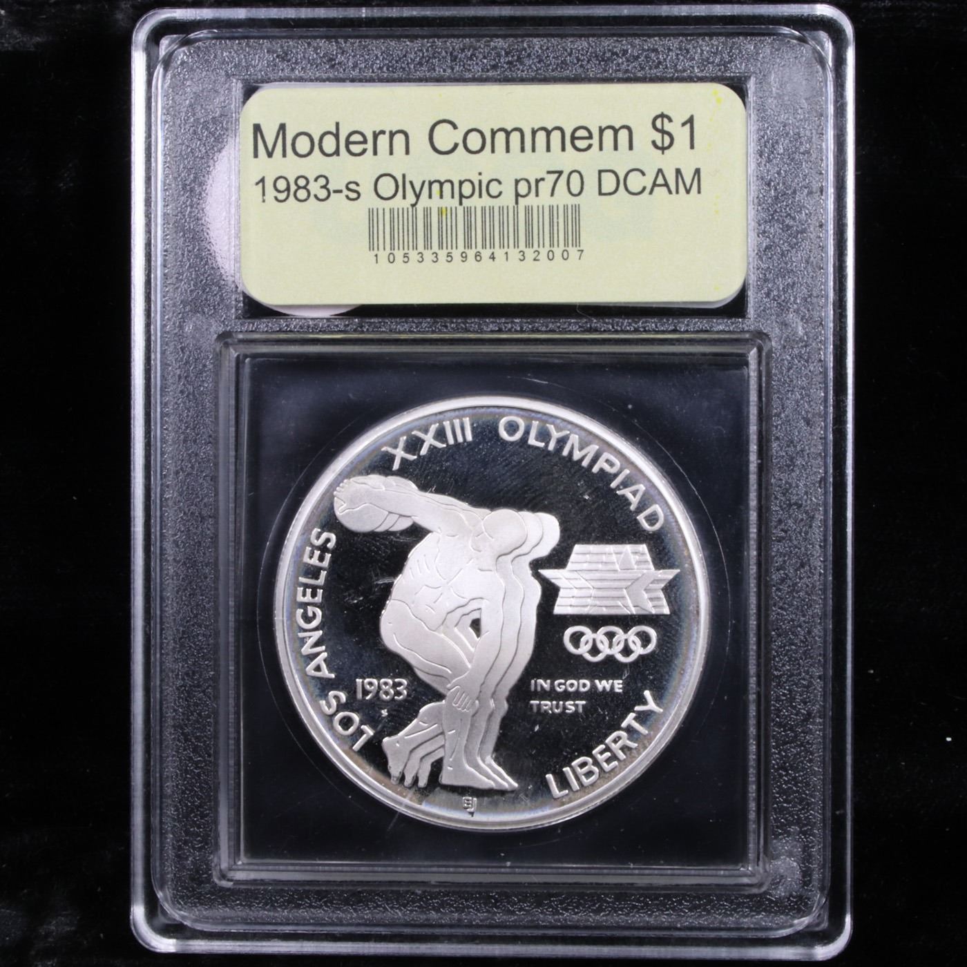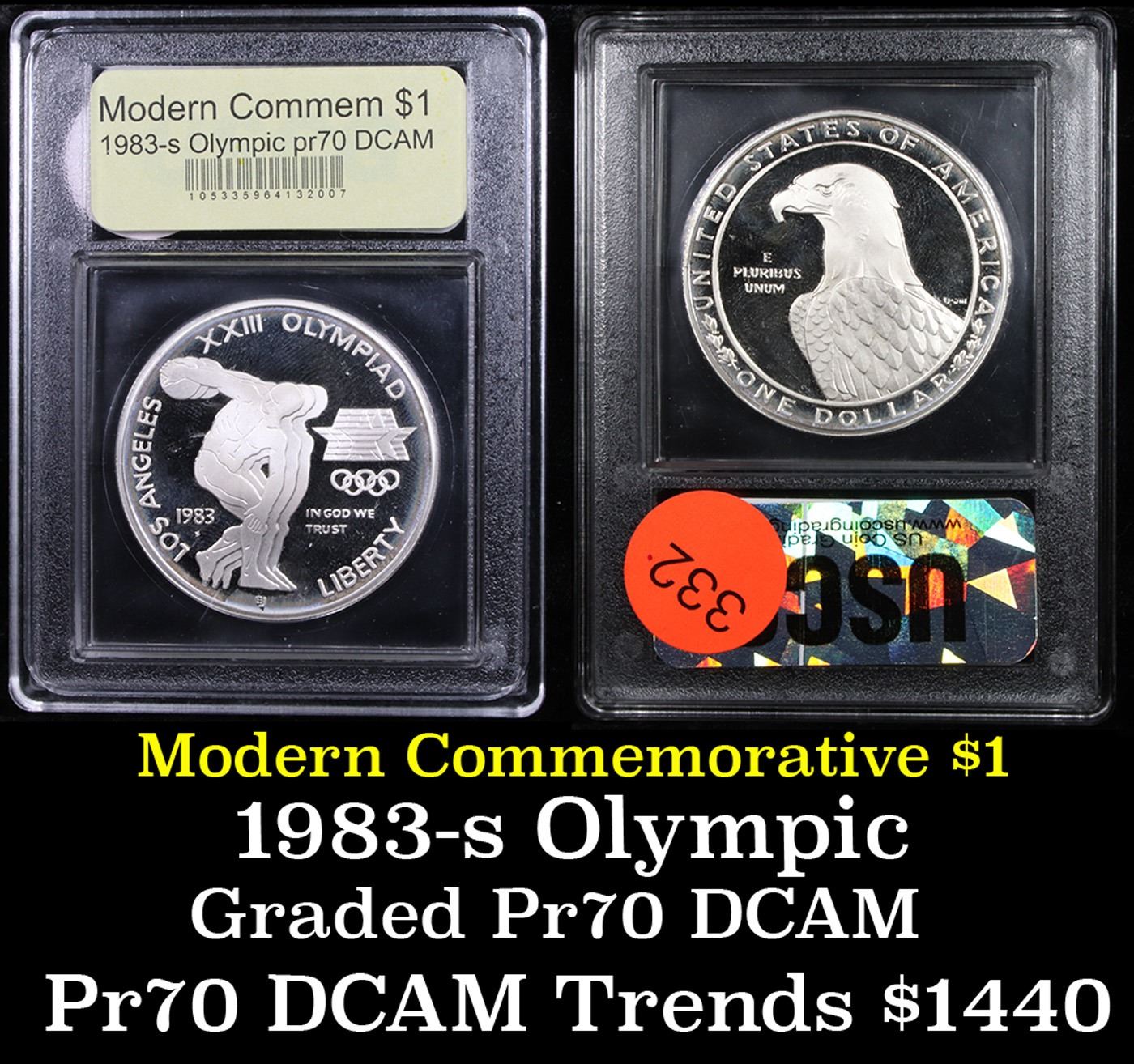 ***Auction Highlight*** 1983-S Olympics Modern Commem Dollar $1 Grades GEM++ Proof Deep Cameo By USCG. 0 One of three coins minted in 1983 to mark the 1984 Olympic games. This example is graded Perfection Gem+++ Proof DCAM by USCG.
