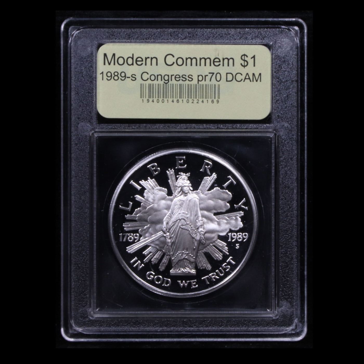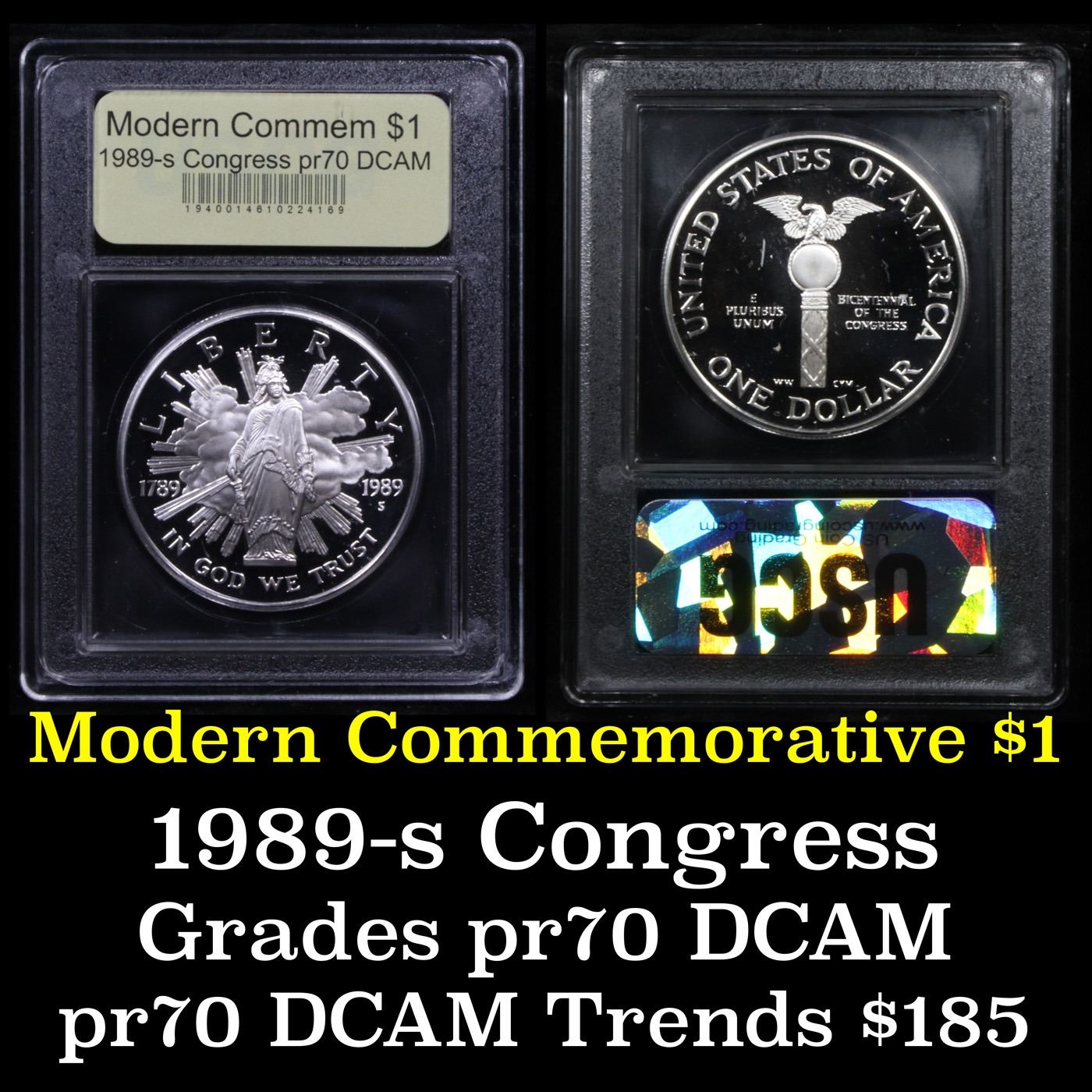 ***Auction Highlight*** 1989-S Congress Modern Commem Dollar $1 Graded GEM++ Proof Deep Cameo By USCG. The 1989 Congress Bicentennial Commemorative Silver Dollar was one of three coins released to celebrate the 200th anniversary of Congress. The legislative body had first convened under the US Constitution in 1789 in Philadelphia. Certified and Graded PR70 Deep Cameo by USCG.
