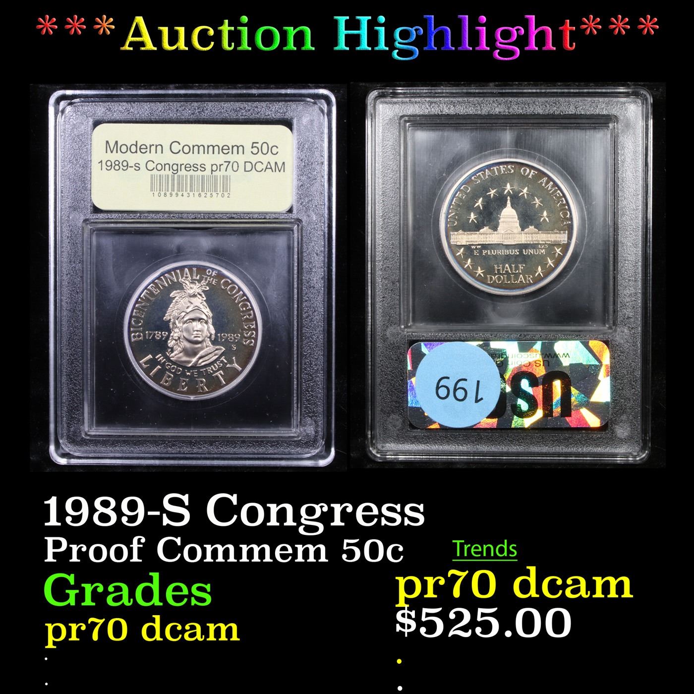 ***Auction Highlight*** 1989-S Congress Modern Commem Half Dollar 50c Graded GEM++ Proof Deep Cameo By USCG. The 1989 Congress Bicentennial Commemorative Half Dollar was one of three coins released to celebrate the 200th anniversary of Congress. The legislative body had first convened under the US Constitution in 1789 in Philadelphia. Certified and Graded PR70 Deep Cameo by USCG. Estimated Value $350