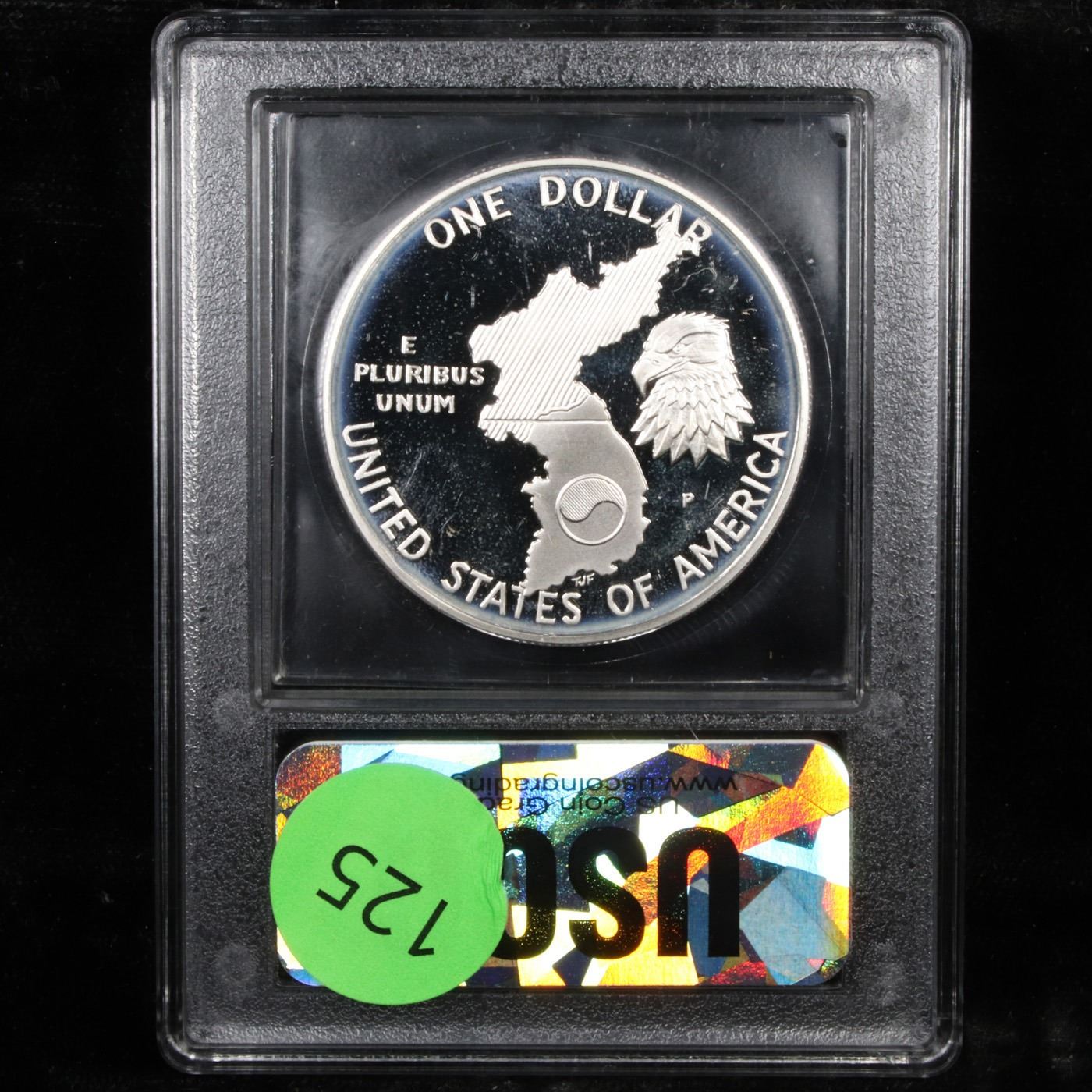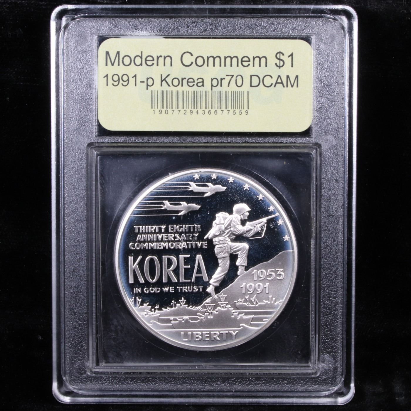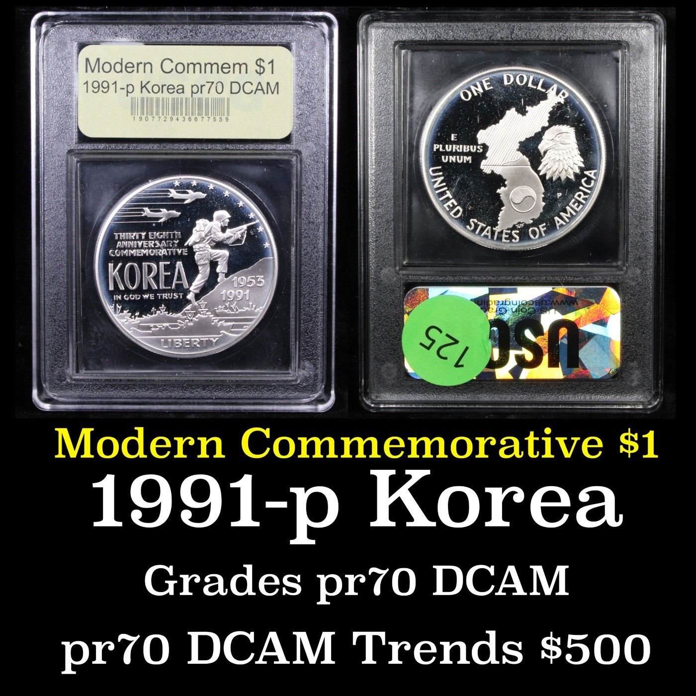 ***Auction Highlight*** 1991-P Korean War Modern Commem Dollar $1 Graded GEM++ Proof Deep Cameo By USCG. The 1991 Korean War Memorial Proof Silver Dollar was issued for the 38th anniversary of the Korean War. The oddly chosen anniversary date is the result of the division between North and South Korea at the 38th degree of latitude. This example was graded PR70 by USCG.