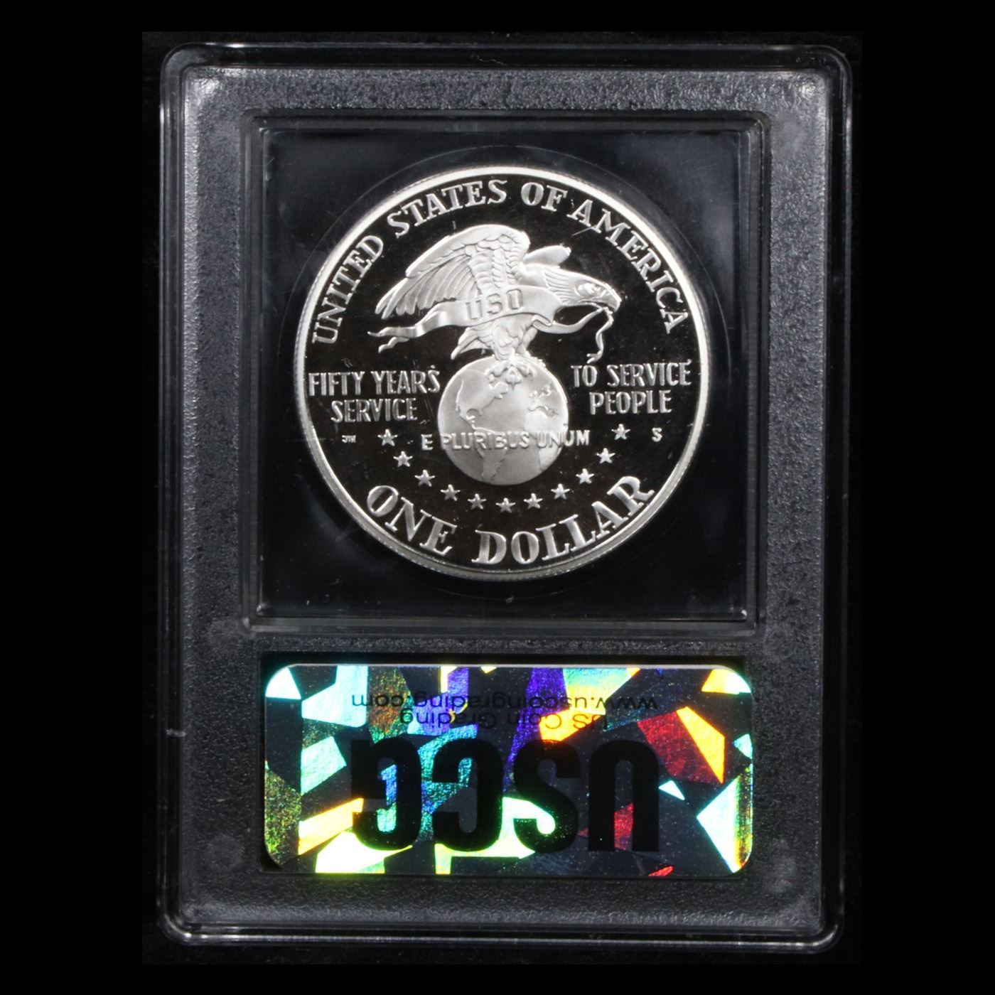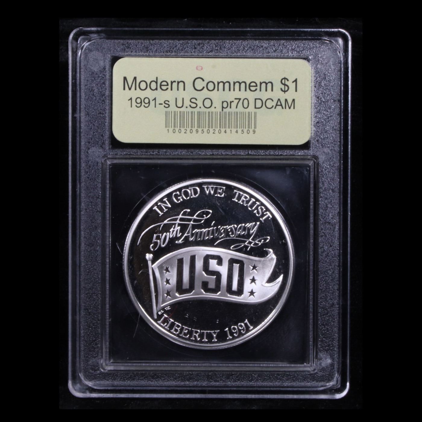 ***Auction Highlight*** 1991-S USO Modern Commem Dollar $1 Graded GEM++ Proof Deep Cameo By USCG. The 1991 USO Silver Dollar was released to mark the 50th anniversary of the United Service Organization. Encapsulated and Graded PR70 DCAM by USCG.