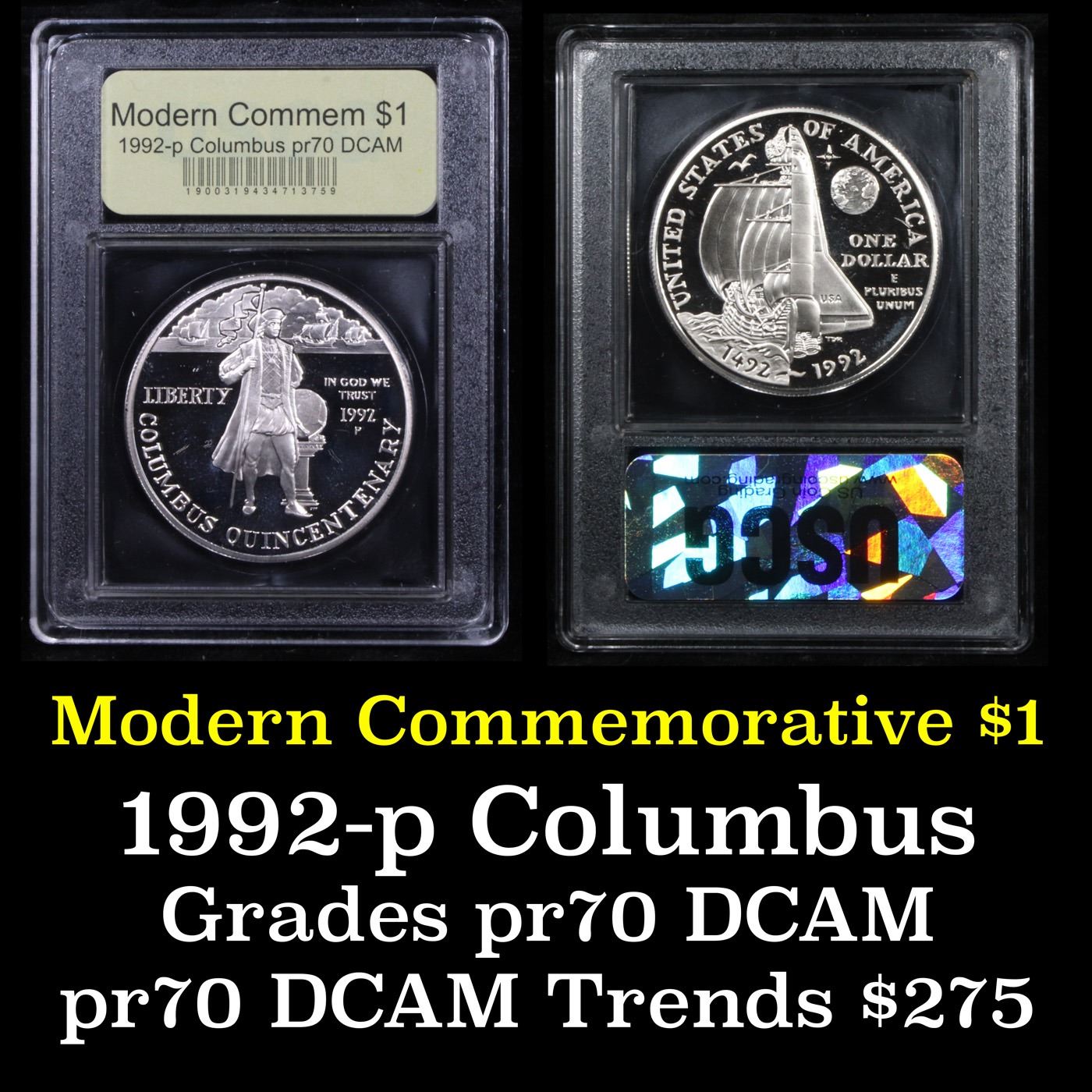 ***Auction Highlight*** 1992-P Columbus Modern Commem Dollar $1 Graded GEM++ Proof Deep Cameo By USCG. An amazing design is on the Reverse of this coin with one of Columbus' ships on the left and merged on the Right with the space shuttle, each showing the means of exploration 500 years apart. This Commemorative was issued to mark the 500th anniversary or quincentenaries' of the discovery of the Americas by Christopher Columbus. This proof dollar is graded PR70 DCAM by USCG. PCGS lists a PR70 DCAM at $2500 Estimated Value $400.