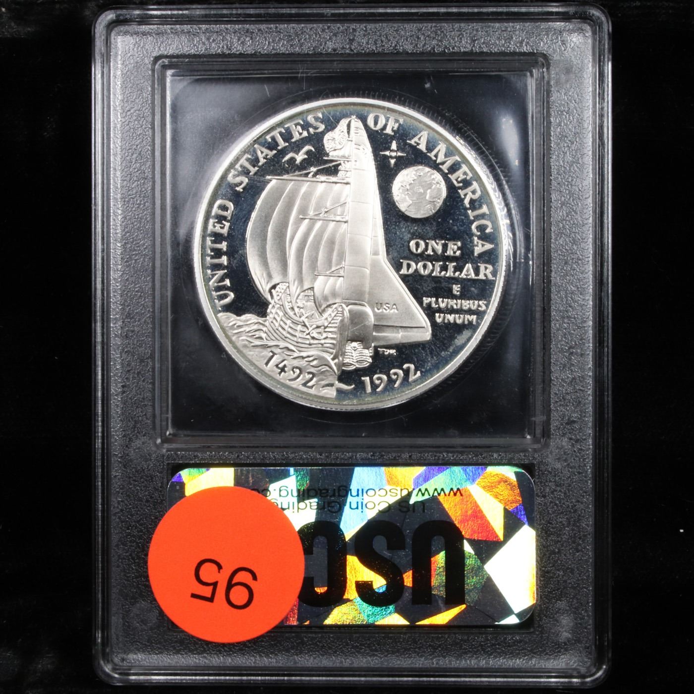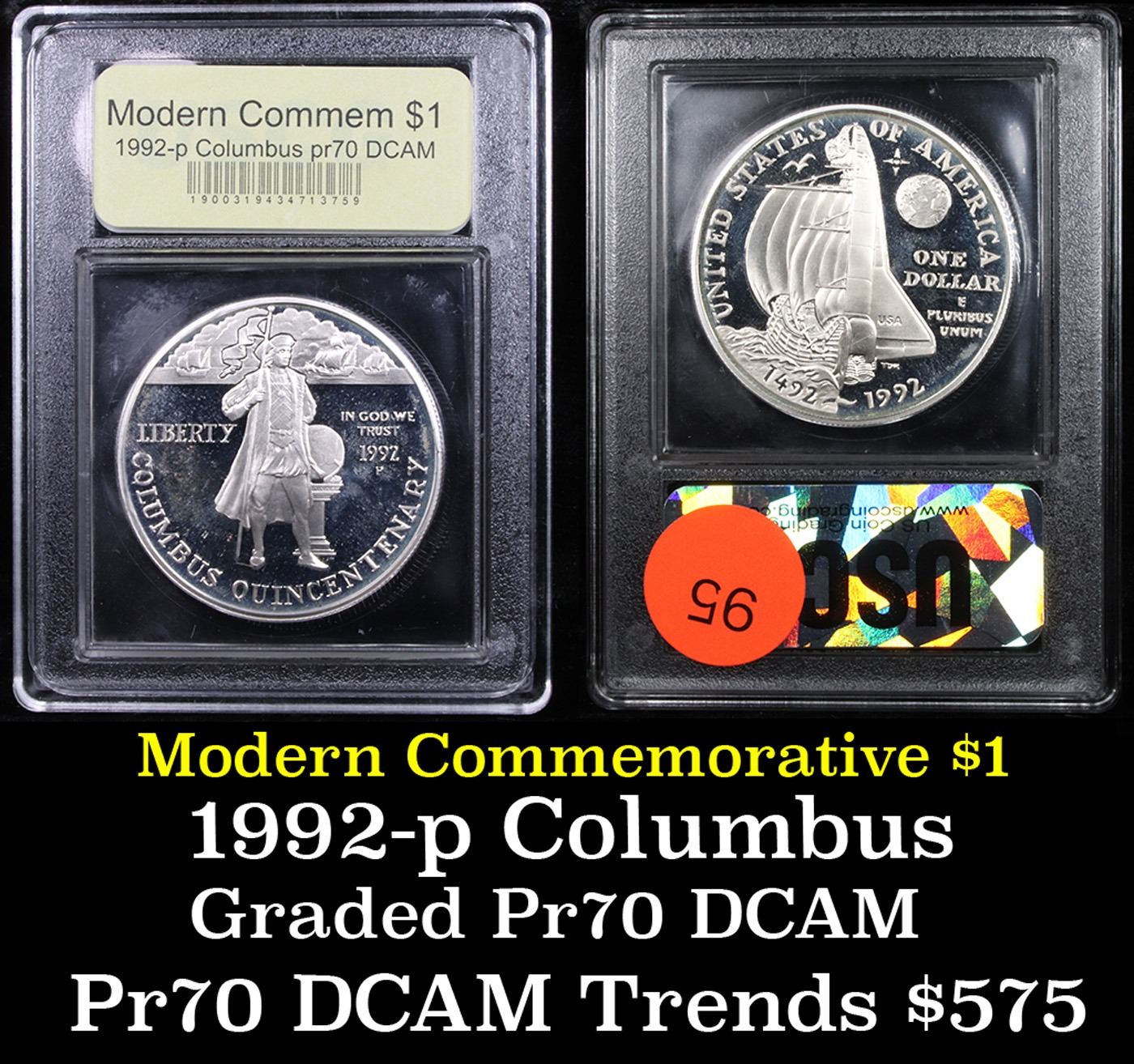 ***Auction Highlight*** 1992-P Columbus Modern Commem Dollar $1 Grades GEM++ Proof Deep Cameo By USCG. An amazing design is on the Reverse of this coin with one of Columbus' ships on the left and merged on the Right with the space shuttle, each showing the means of exploration 500 years apart. This Commemorative was issued to mark the 500th anniversary or quincentenary of the discovery of the Americas by Christopher Columbus. This proof dollar is graded PR70 DCAM by USCG.