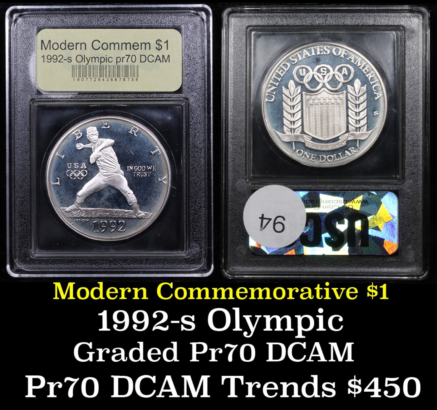 ***Auction Highlight*** 1992-S Olympic Modern Commem Dollar $1 Graded GEM++ Proof Deep Cameo By USCG. The 1992 Olympic Silver Dollar was issued for the XXV Olympic Games. The 1992 Olympic Silver Dollar Commemorative coin features a baseball player throwing a pitch. Although it is very similar to an image of Nolan Ryan which appeared on a Fleer baseball card. The designer of the coin John R. Deecken denied that there was any connection. This coin is graded Perfection Gem+++ Proof DCAM by USCG.