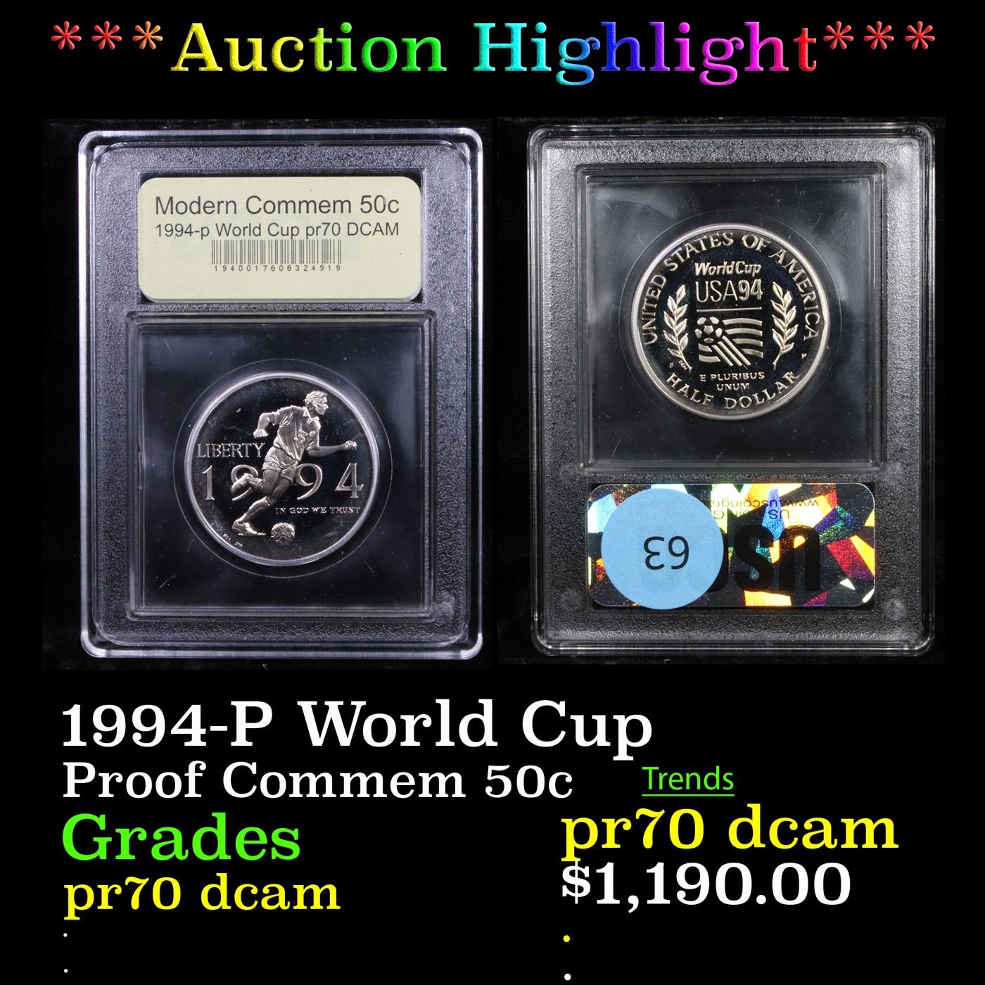 ***Auction Highlight*** 1994-P World Cup Modern Commem Half Dollar 50c Graded GEM++ Proof Deep Cameo By USCG. The 1994 World Cup Half Dollar was issued as part of a three coin program to celebrate the XV FIFA World Cup playoff. It does not list a value, auction trends indicate $1400. This Perfect coin is graded PR70 Deep cameo by USCG. Estimated Value $250