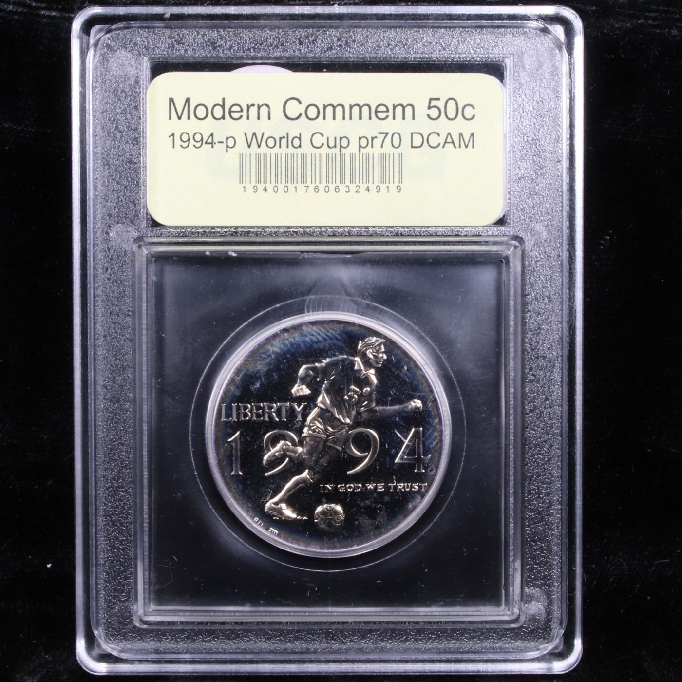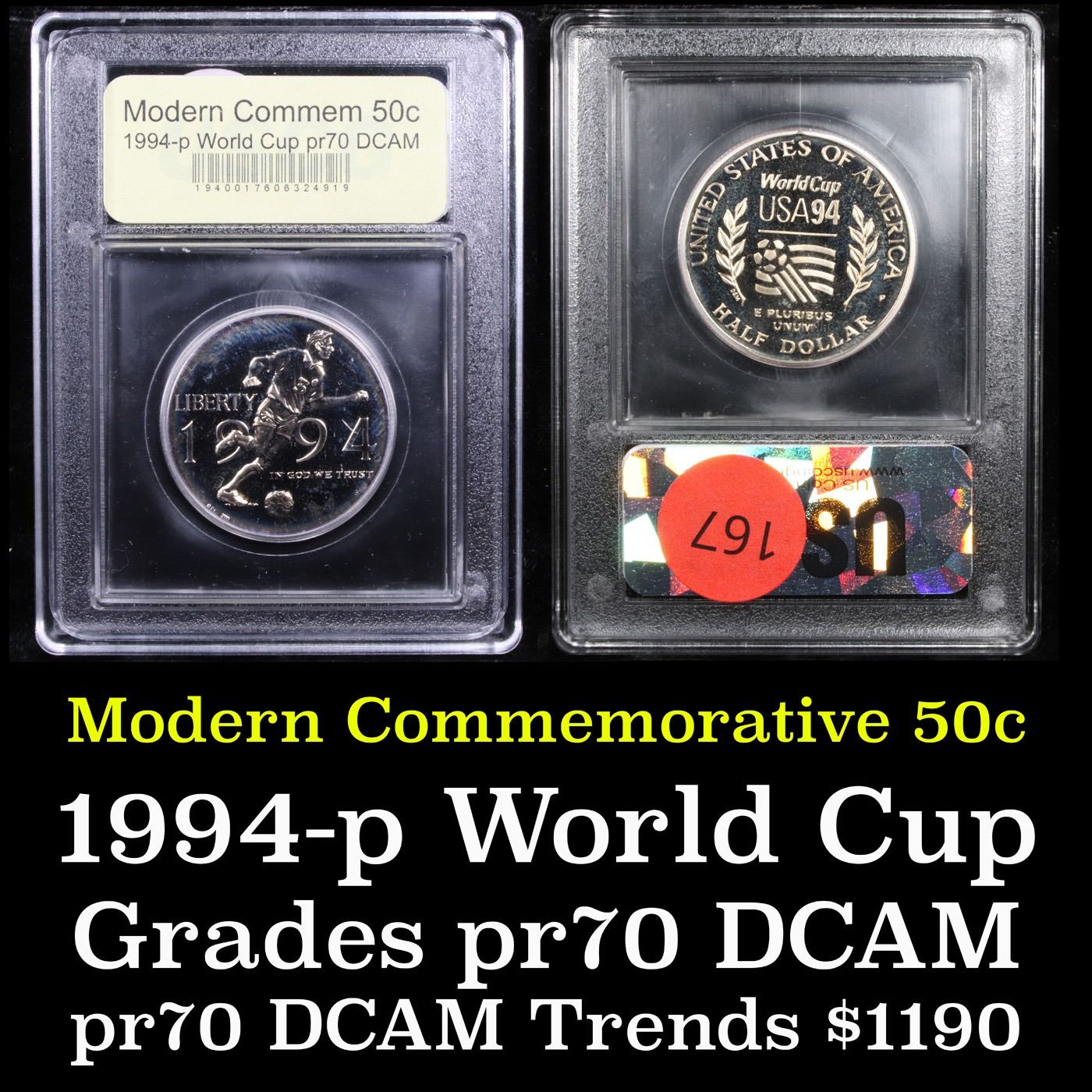 ***Auction Highlight*** 1994-P World Cup Modern Commem Half Dollar 50c Grades GEM++ Proof Deep Cameo. The 1994 World Cup Half Dollar was issued as part of a three coin program to celebrate the XV FIFA World Cup playoff. It does not list a value, auction trends indicate $1400. This Perfect coin is graded PR70 Deep cameo by USCG. Estimated Value $250