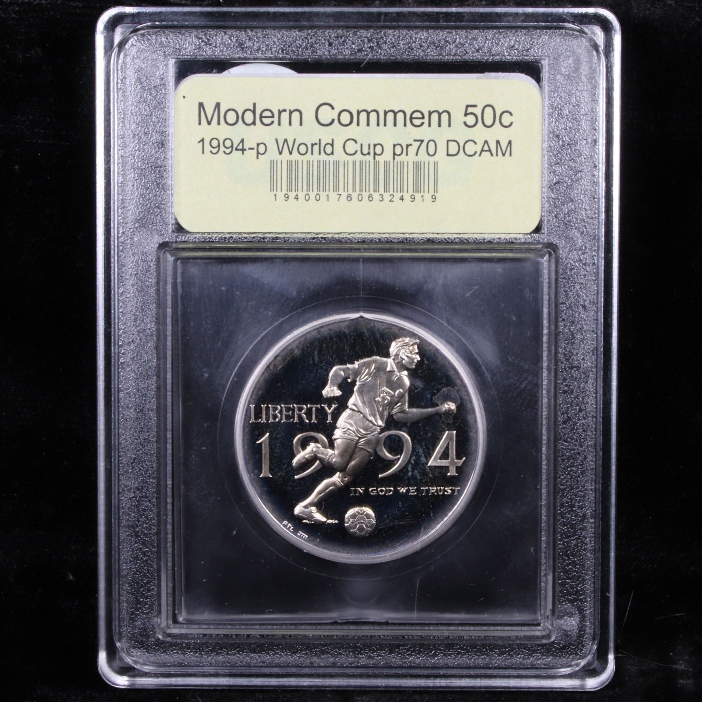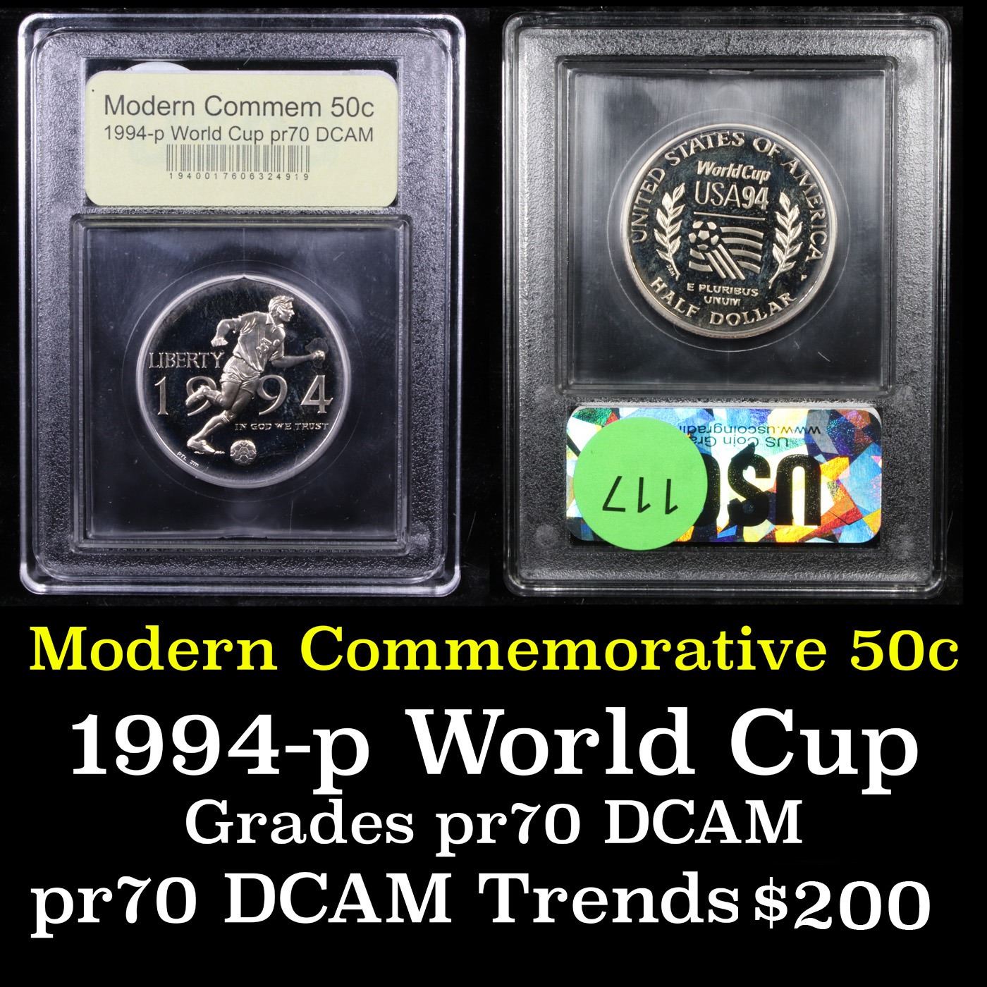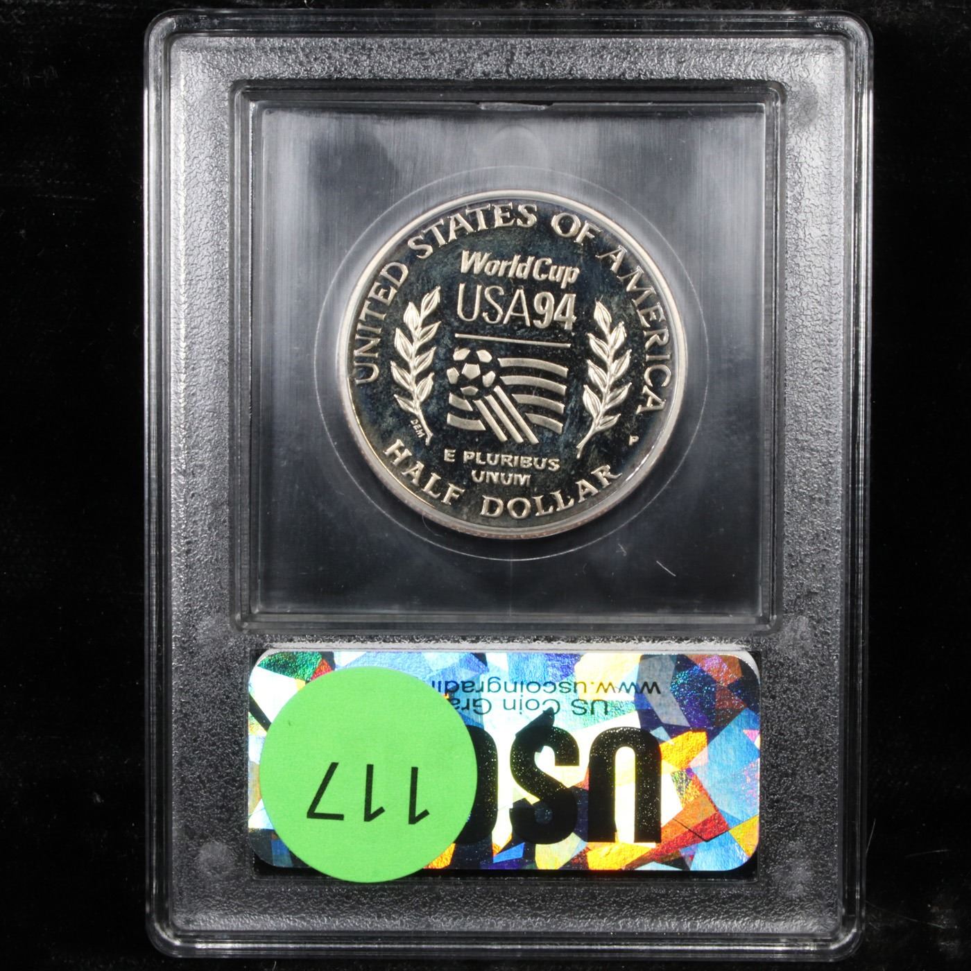 ***Auction Highlight*** 1994-P World Cup Modern Commem Half Dollar 50c Grades GEM++ Proof Deep Cameo. The 1994 World Cup Half Dollar was issued as part of a three coin program to celebrate the XV FIFA World Cup playoff. It does not list a value, auction trends indicate $1400. This Perfect coin is graded PR70 Deep cameo by USCG. Estimated Value $250